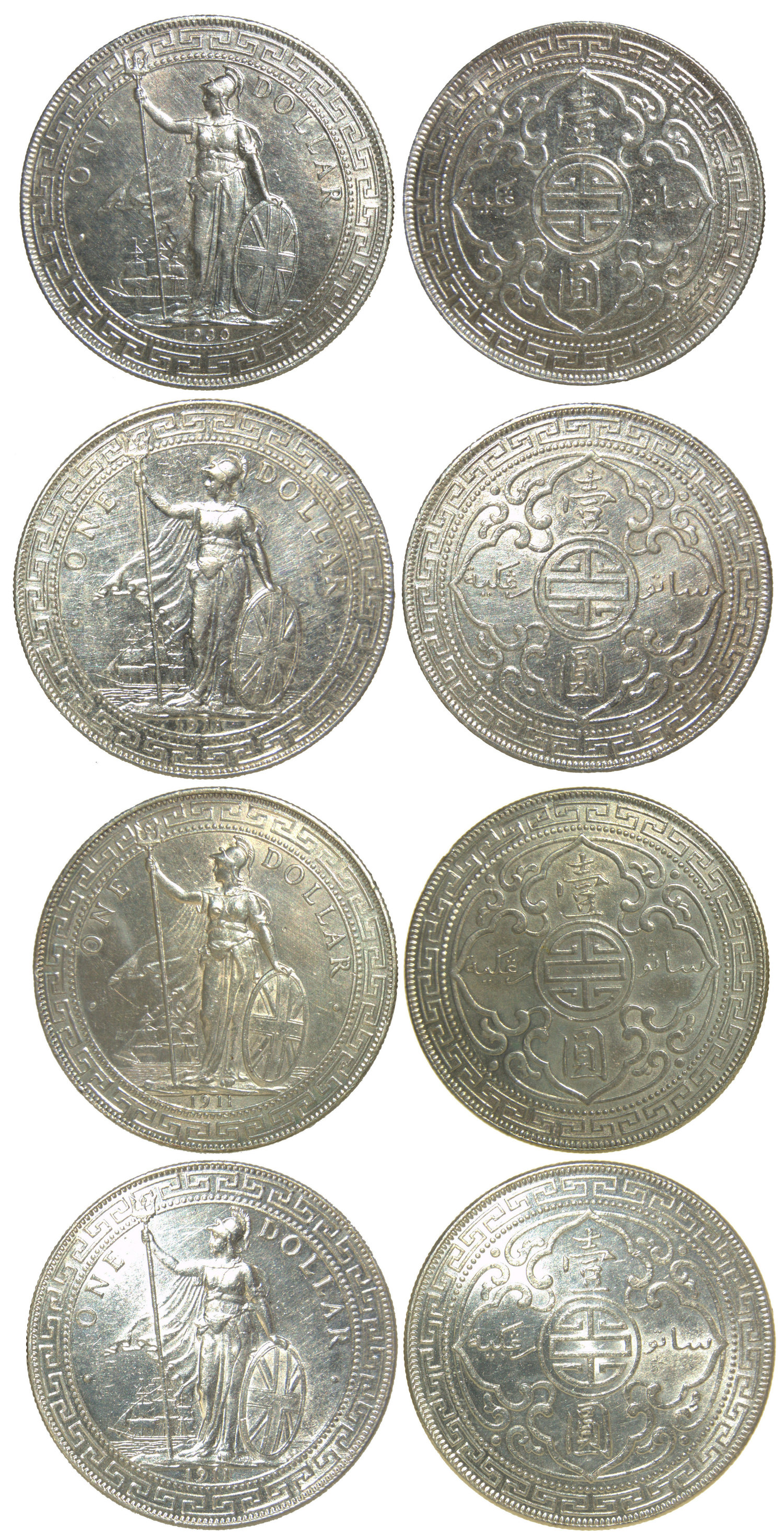 Great Britain, lot of 4x silver trade dollars, 1911-B (3) and 1930, Britannia on reverse,