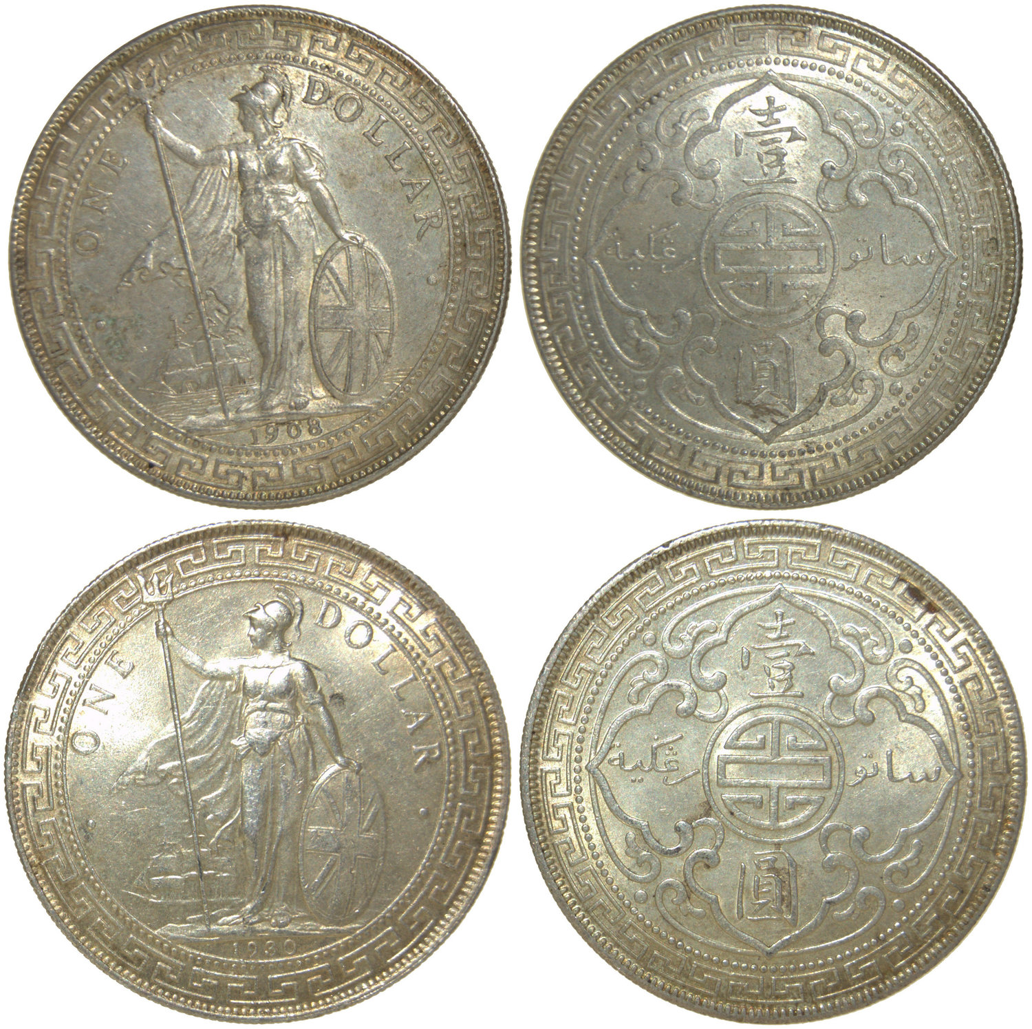 Great Britain, lot of 2x silver trade dollars, 1908-B and 1930, Britannia on reverse,