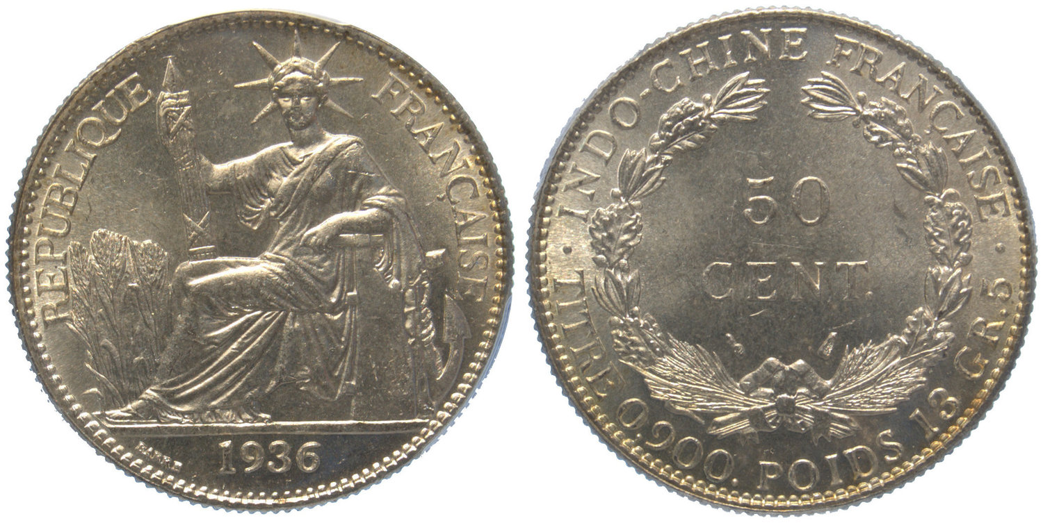 French Indo China, silver 50 cents, 1936, PCGS MS64, choice in this grade