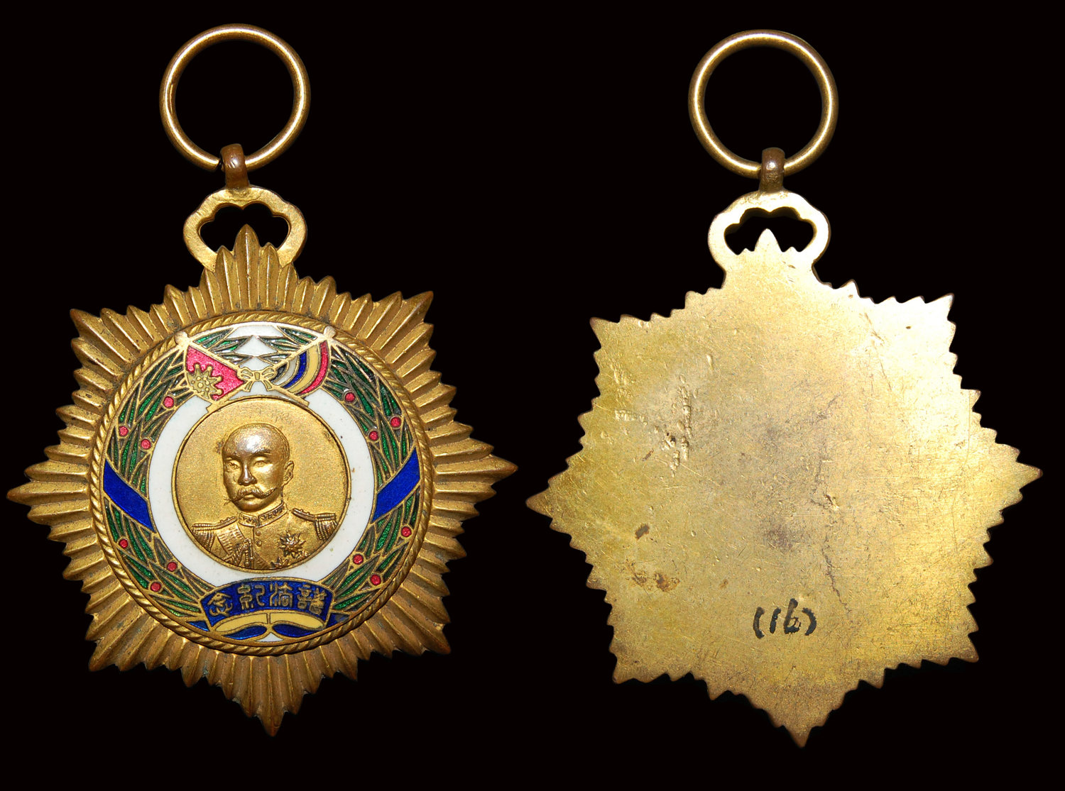 China,enameled medal, cir.1918,crossed flags at upper centre, bust of Lu Jung Ting at centre, four Chinese characters below,