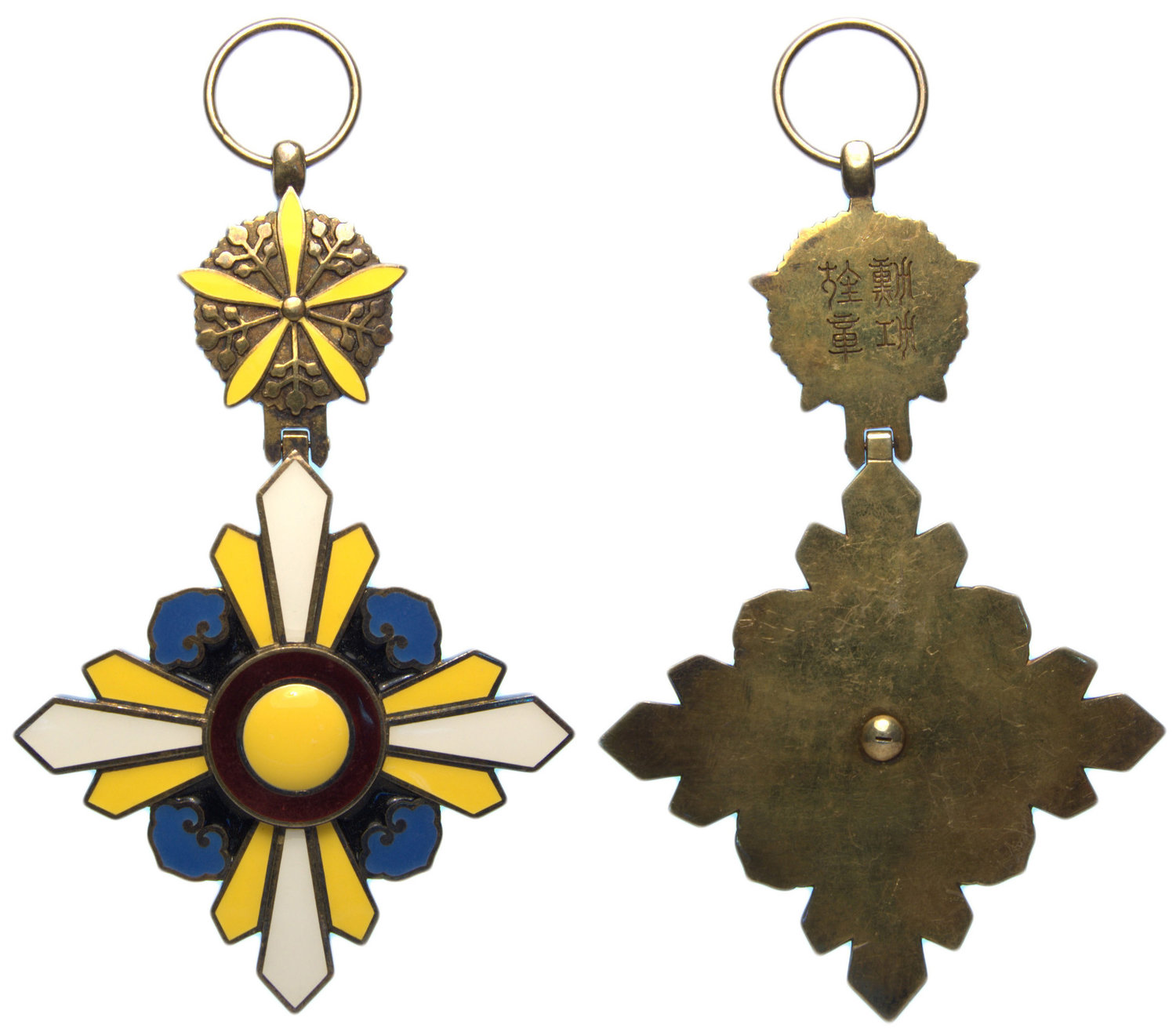 Manchukuo,Order of the Auspicious Clouds, white enamel cross with yellow point on either side of each arm, blue clouds emblem on black ground, red and yellow enamel rings at centre, suspended from a gold orchid blossom with enamel petals,established by Emperor Pu Yi of Manchukuo on March 1 1934, as an award to Japanese officers and Chinese officials who cooperated with his reign.