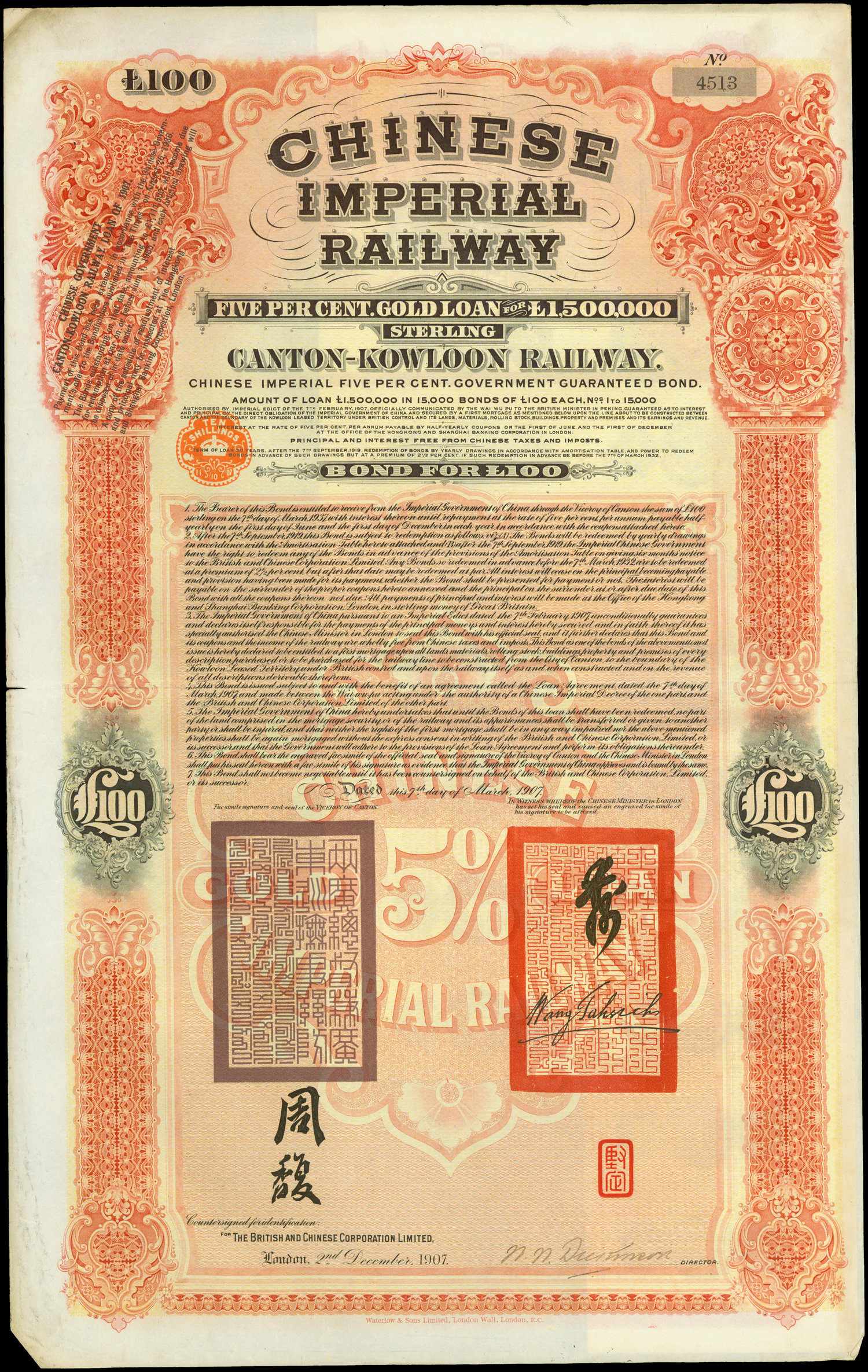 1907 5% Canton-Kowloon Railway Gold Loan,2 x ?100 bonds, issued by the British and Chinese Corporation Limited, number 4513-4,large format, orange and black, printed by Waterlow & Sons, with coupons,