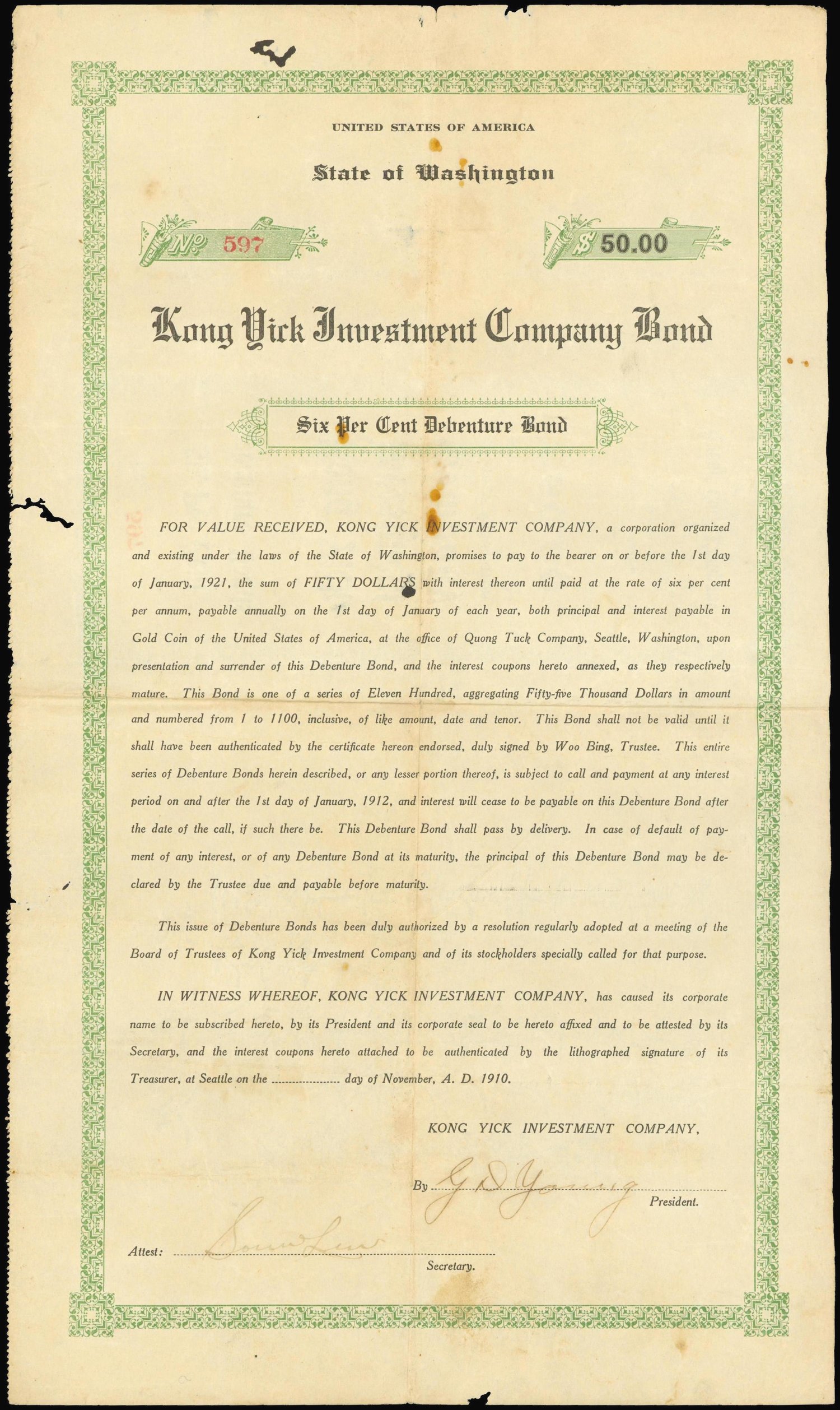 Kong Yick Investment Company, Washington, U.S.A.,6% debenture bonds, $50, 1910, number 597,green ornate border, black text in English, reverse text in Chinese and English,