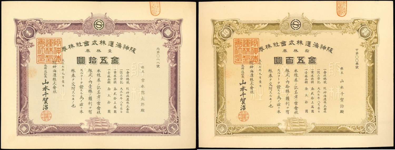 Hanshin Shipping Company Limited, Japan,certificates of 50 and 500 gold yen, number 88 and 3,Dark purple and olive ornate border respectively, similar design with a sailing boat at bottom centre, red chops,