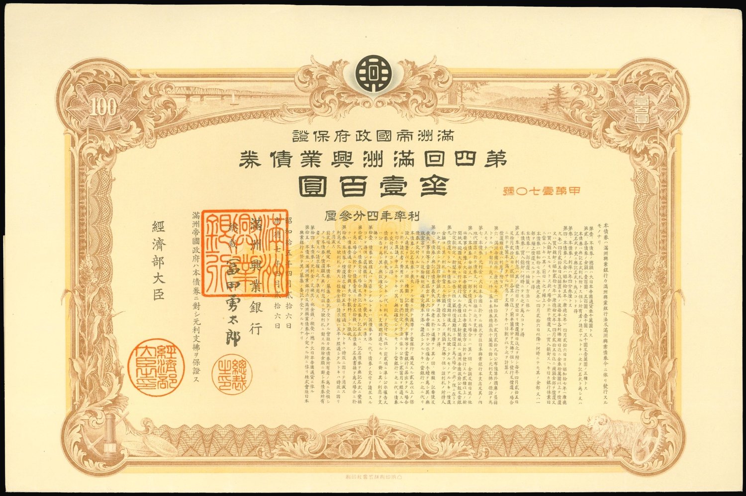 The 4th Manchukuo Industrial Loan,bond for 100 gold yuan, 1940, number A170,brown and yellow-brown, ornate border, red chops,