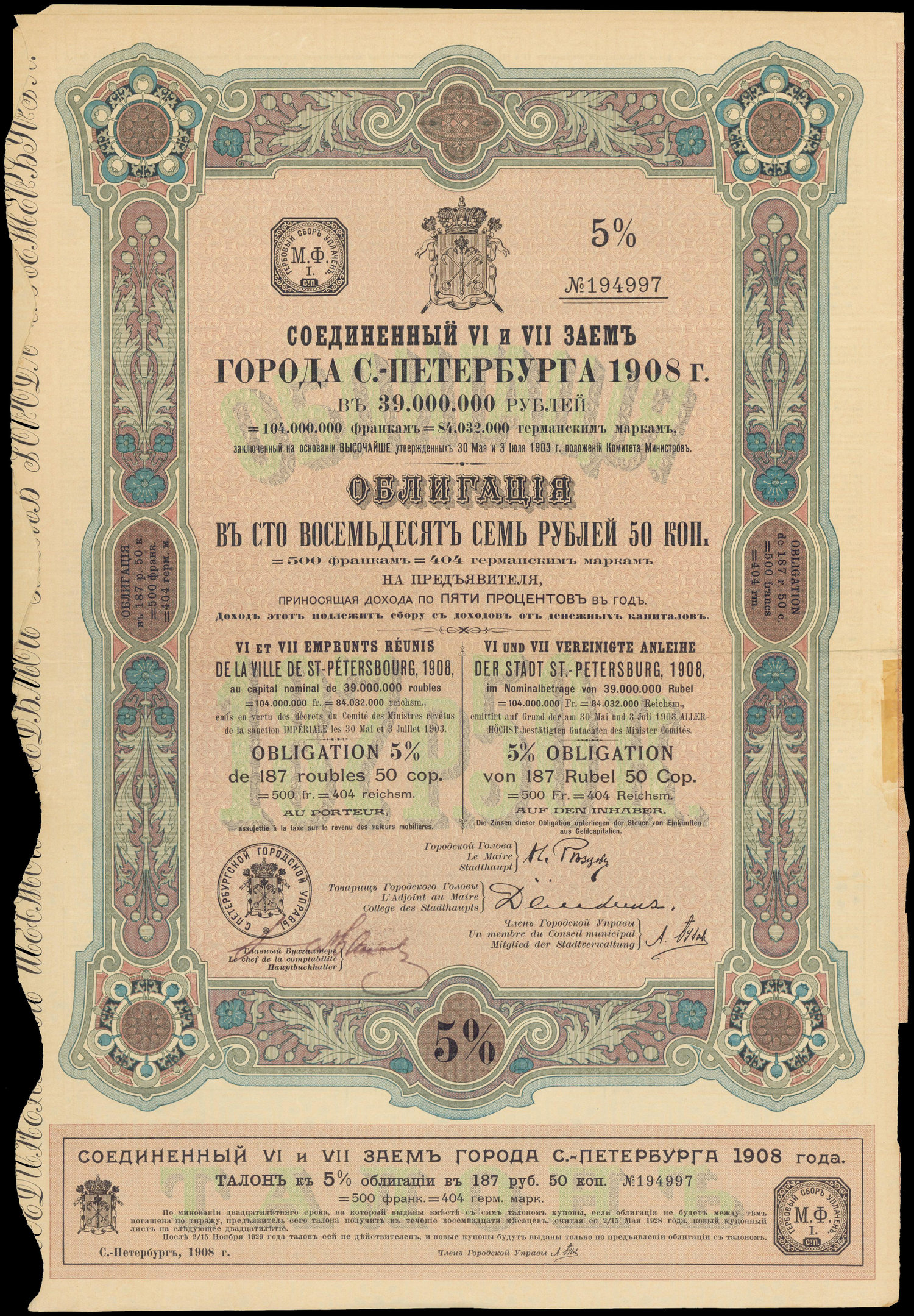 Russia, 5% bond for 187.50 roubles, 1903, serial number 194997, very fine