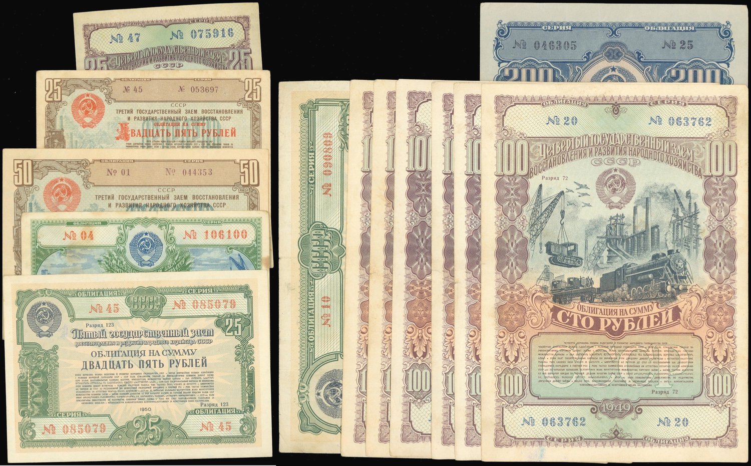 Russia, a group of 13 bonds consisting of, 1949 series 20, 100 rouble bonds (6), 25 roubles (4), 50 rouble (1), series 10, 100 roubles (1) and 1948, 200 roubles (1)