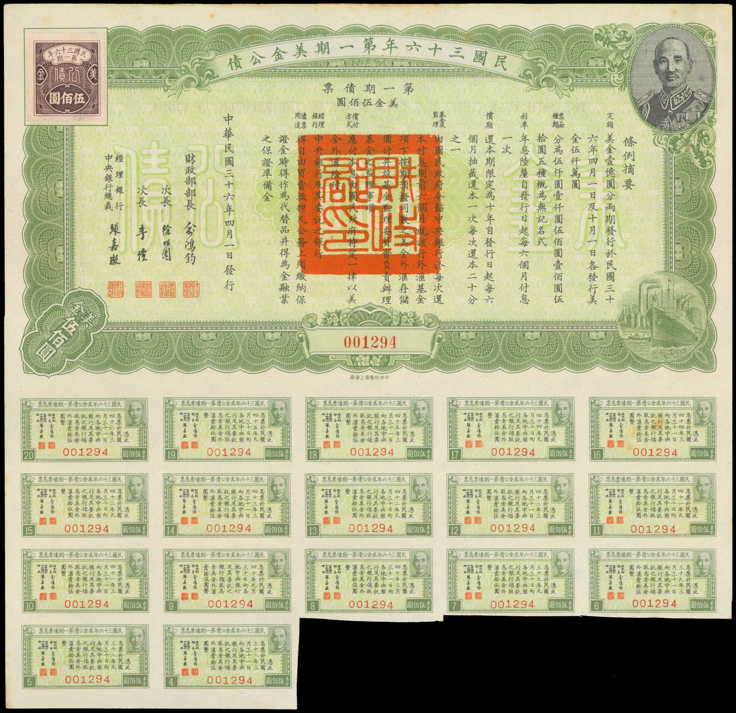 1947 36thYear U.S. Gold Loan,first issue, $500, number 001294,green, ornate border, Chang Kai Shek at top right, violet revenue stamp top left, large red chop at centre, with most coupons remain, reverse blue-green, text in English,