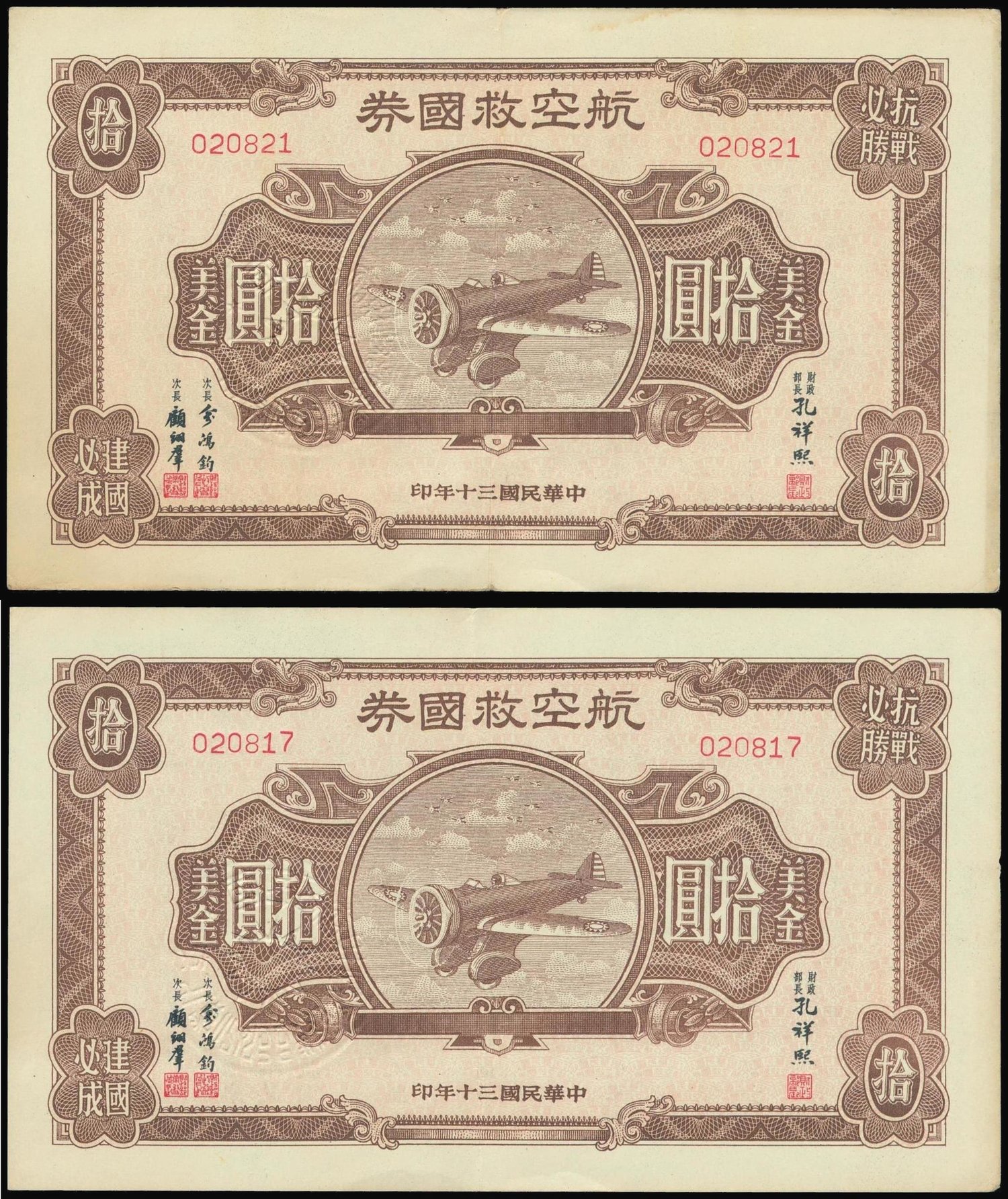 National Aviation Bonds, lot of 2 for U.S. $10, 1941, serial numbers 020817 and 020821, brown, flying aeroplane bearing the Kuomintang emblem at centre, signed by Kong Changxi,