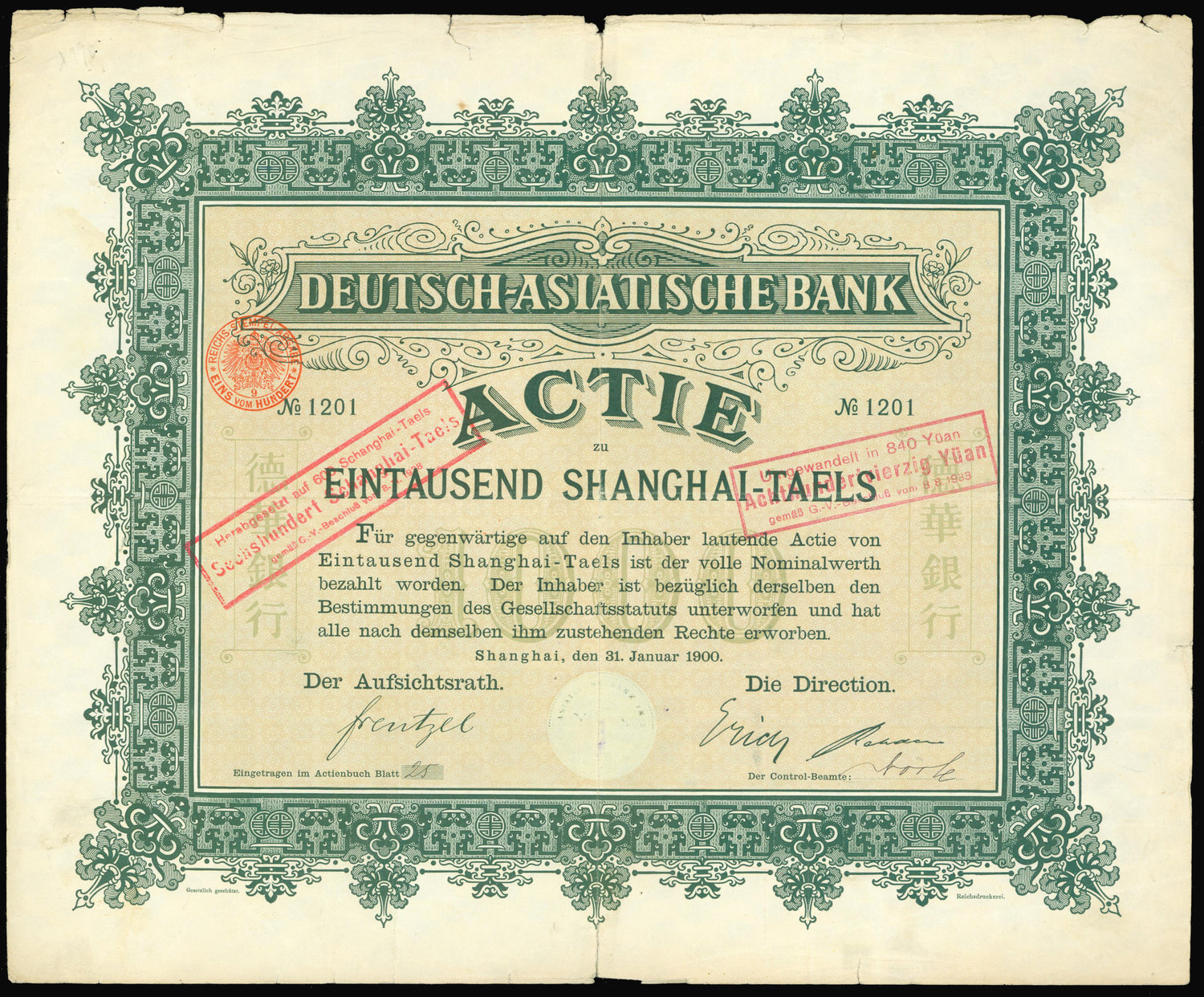 Deutsch-Asiatische Bank, Shanghai,certificate of shares for 1000 Shanghai taels, 1900, number 1201,green on yellow-brown underprint, ornate border, bank name in English at top centre, text in German, Chinese bank name left and right,