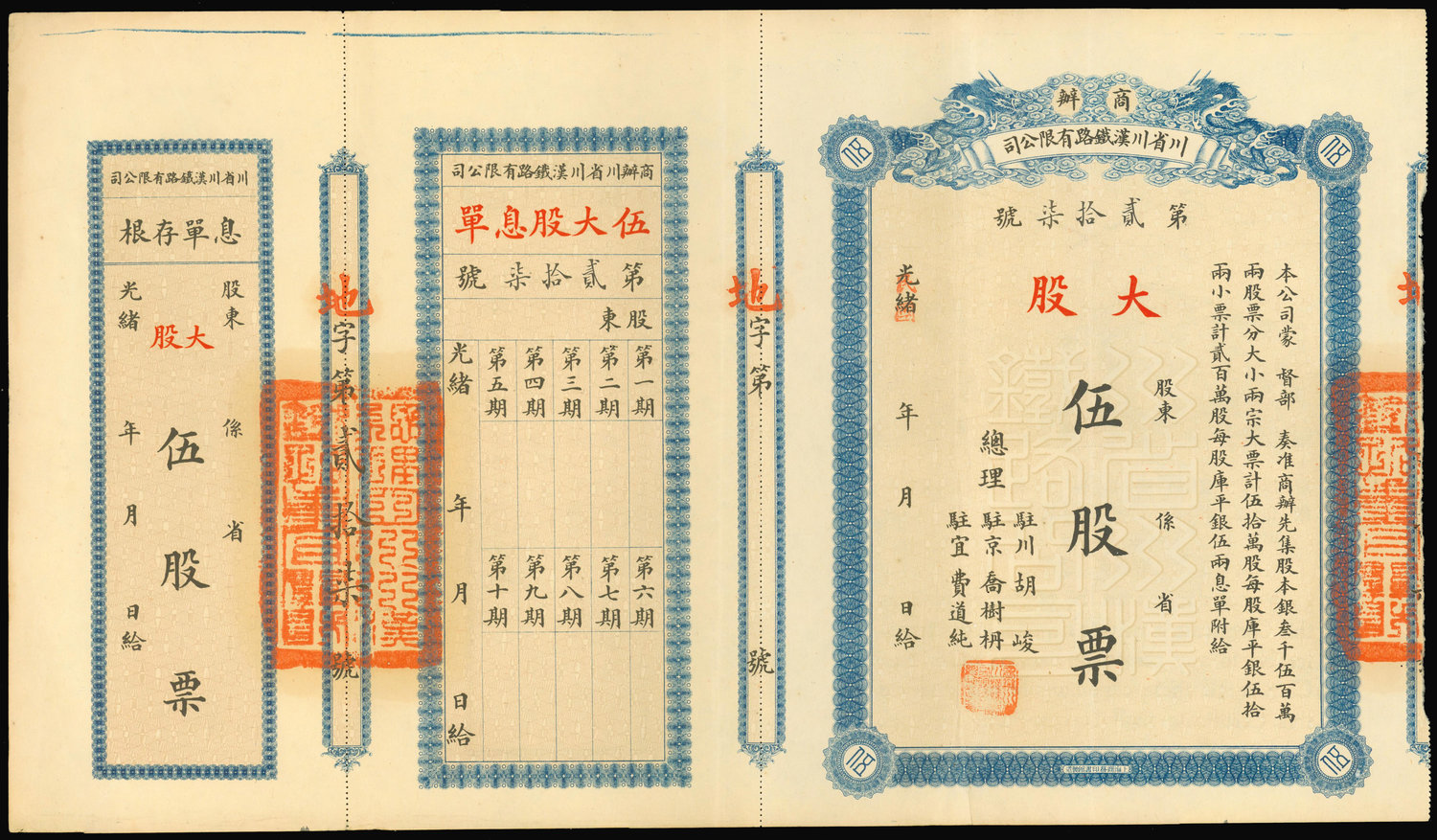 Szechuan Hanzhong Railway Company Limited,5 shares of 5 taels, remainder, ‘Republic’ overprinted on ‘Kuangxu’, number 27,blue ornate border, dragons at top, pale green underprint, reverse black, steam train with crossed dragon flags at top, text in English and Chinese below,