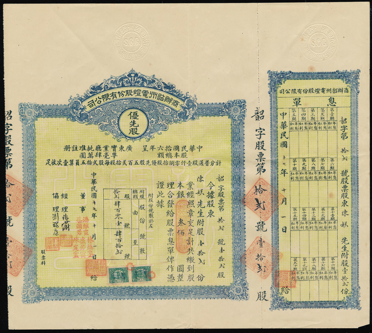 Shaozhou Electric Company Limited, 25 yuan shares, 1928, capital of 40,000 yuan, number 12, green and blue, various red chops/handstamps and revenue stamps, counterfoil at right,