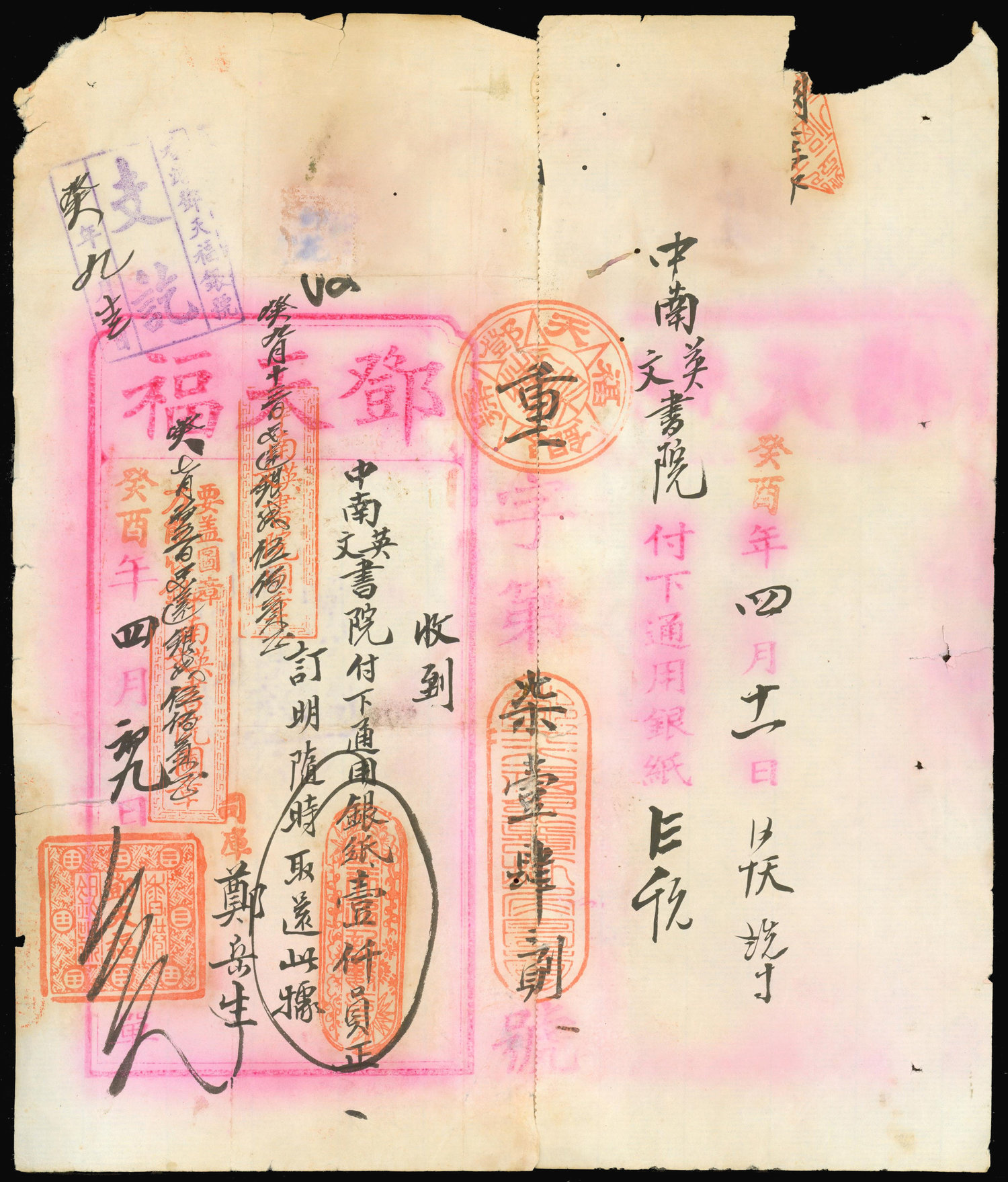 Tang Tin Fuk Bank, Hong Kong,$1000 receipt to Chung Nam College, cir. 1933,red on white, brush writing, multiple red chops,