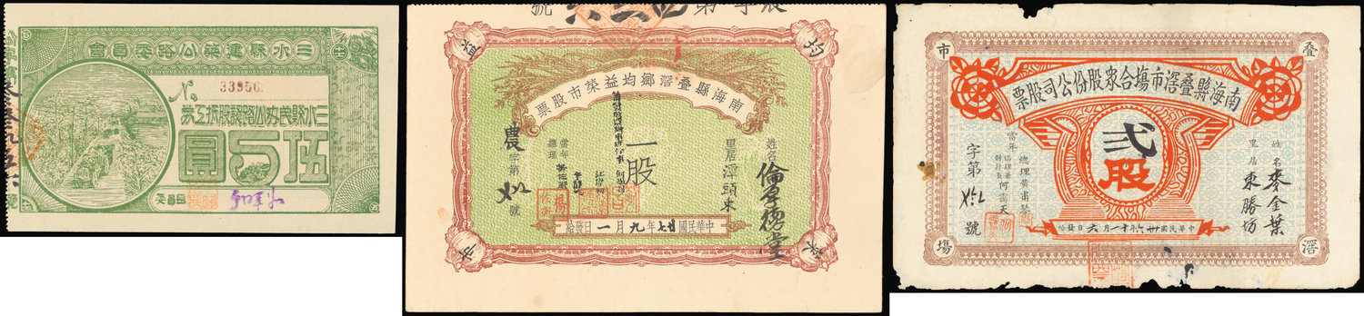 Local Issue,San Shui Xian motorway 5 yuan coupon, Nan Hai Xian Die Jiao, certificates of shares(2), Republican era,5 yuan coupon green on obverse, reverse blue, others brown on green underprint and red, brown on light blue underprint respectively, all small format,