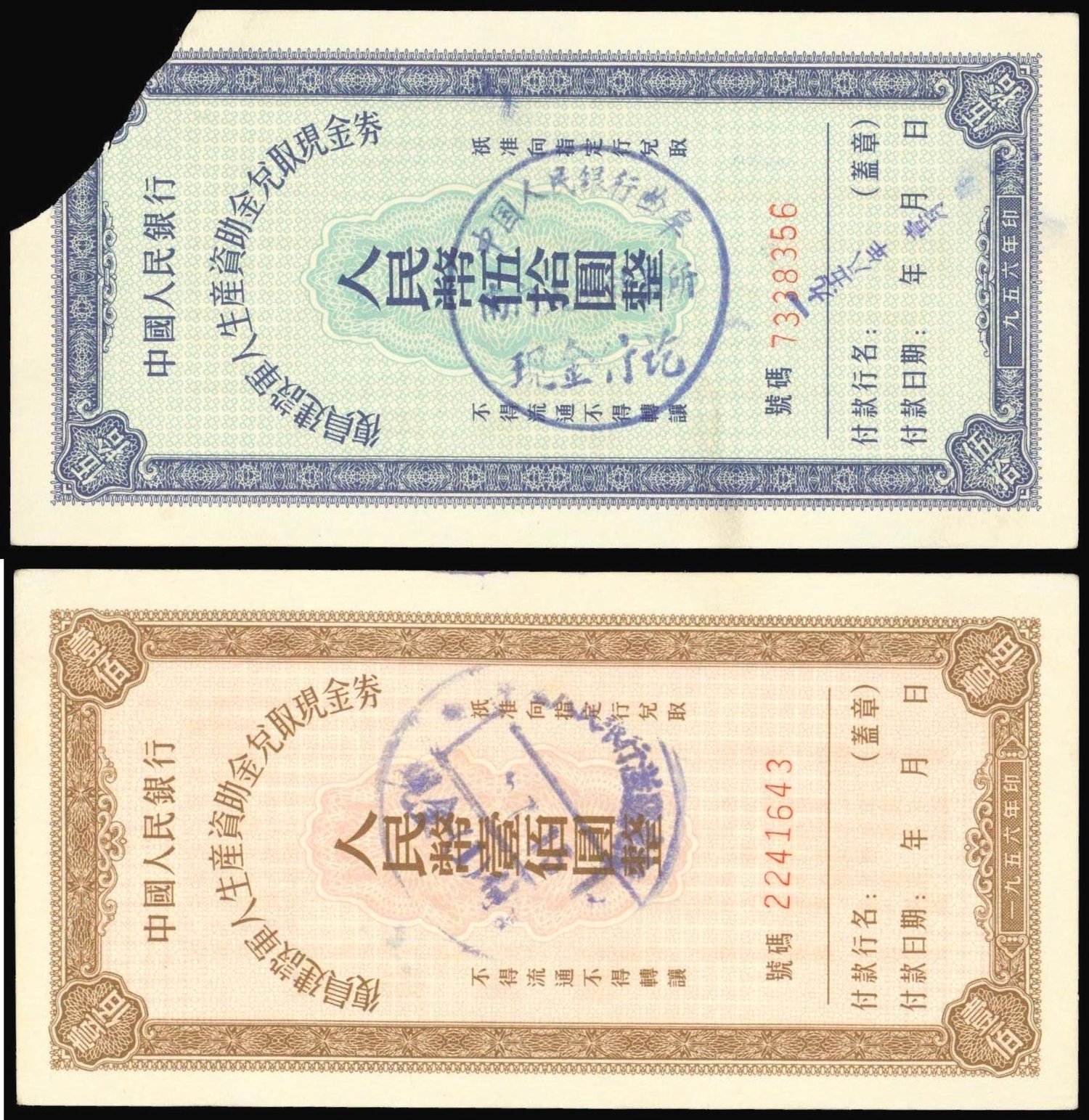 People’s Bank of China,cash coupons for soldiers, 1958, 50 and 100 yuan,blue and brown respectively,
