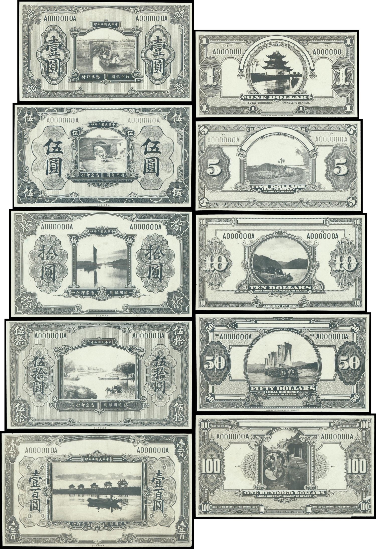 Republican era, arvhival photographic proofs, unknown bank, (either Bank of China and Bank of Communications), 1, 5, 10, 50 and 100 yuan, various rural landscapes, unissued designs, 1913,