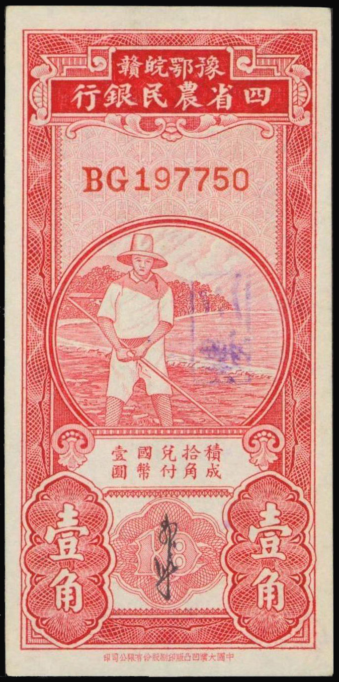 Agricultural Bank of the Four Provinces, 10 cents, ND(1933), serial number BG197750, red, small vertical format, farmer at centre, reverse green,