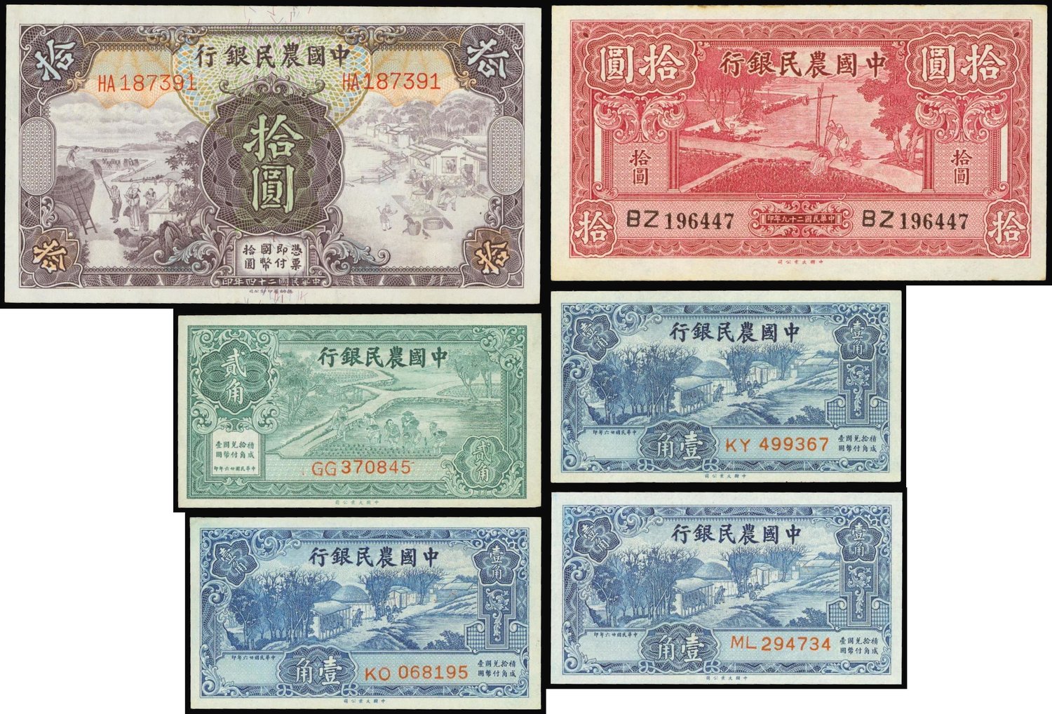 The Farmers Bank of China,mixed lot of 10 cents(3), 20 cents(1), 10 yuan(2), 1937, 1935, 1940,blue, green, dark violet and red respectively,