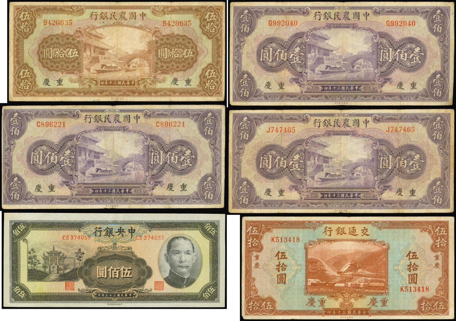 Republican era, lot of 6 banknotes, Central Bank of China, 500 yuan, 'Pai Fang' series, 1945, also Farmers Bank of China 50, 100 yuan and Bank of Communications 50 yuan, 1941,