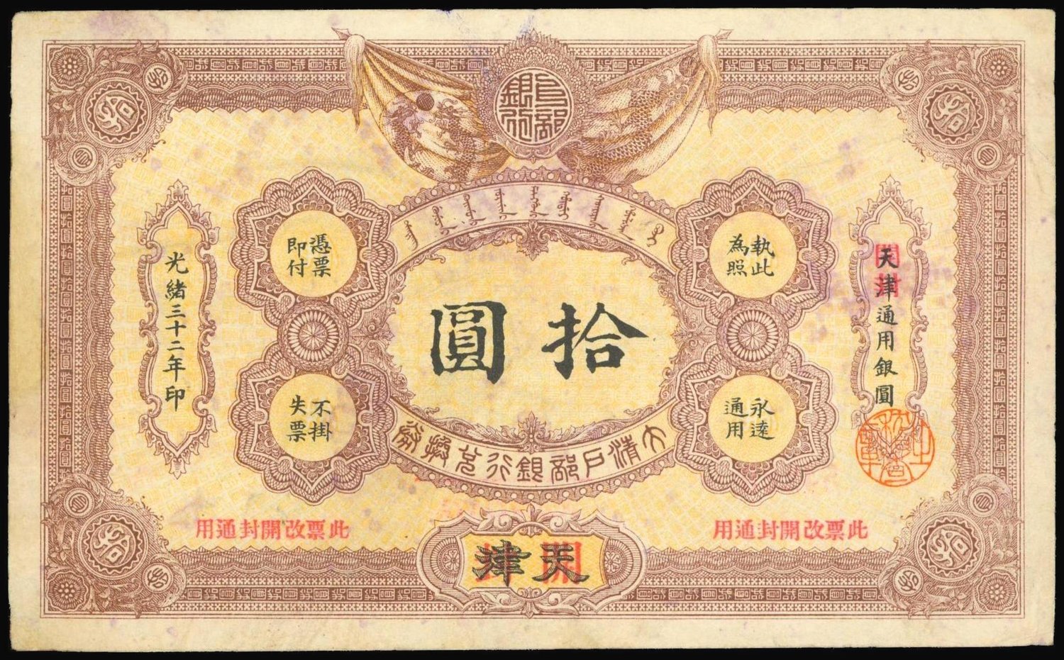 Ta Ching Government Bank,$10, 1906, Kaifong overprinted on Tientsin, serial number 54229, unsigned remainder,purple on yellow underprint, flags at top centre, reverse light green on pale blue underprint,