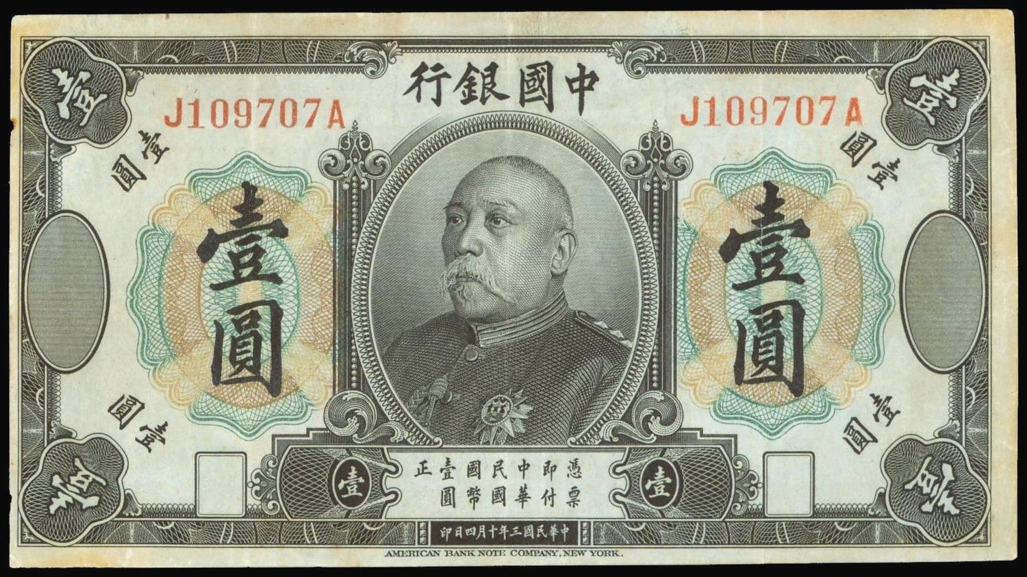 Bank of China,1 yuan, 1914, serial number J109707A,black and multicolour, Yuan Shih Kai at centre, reverse black,
