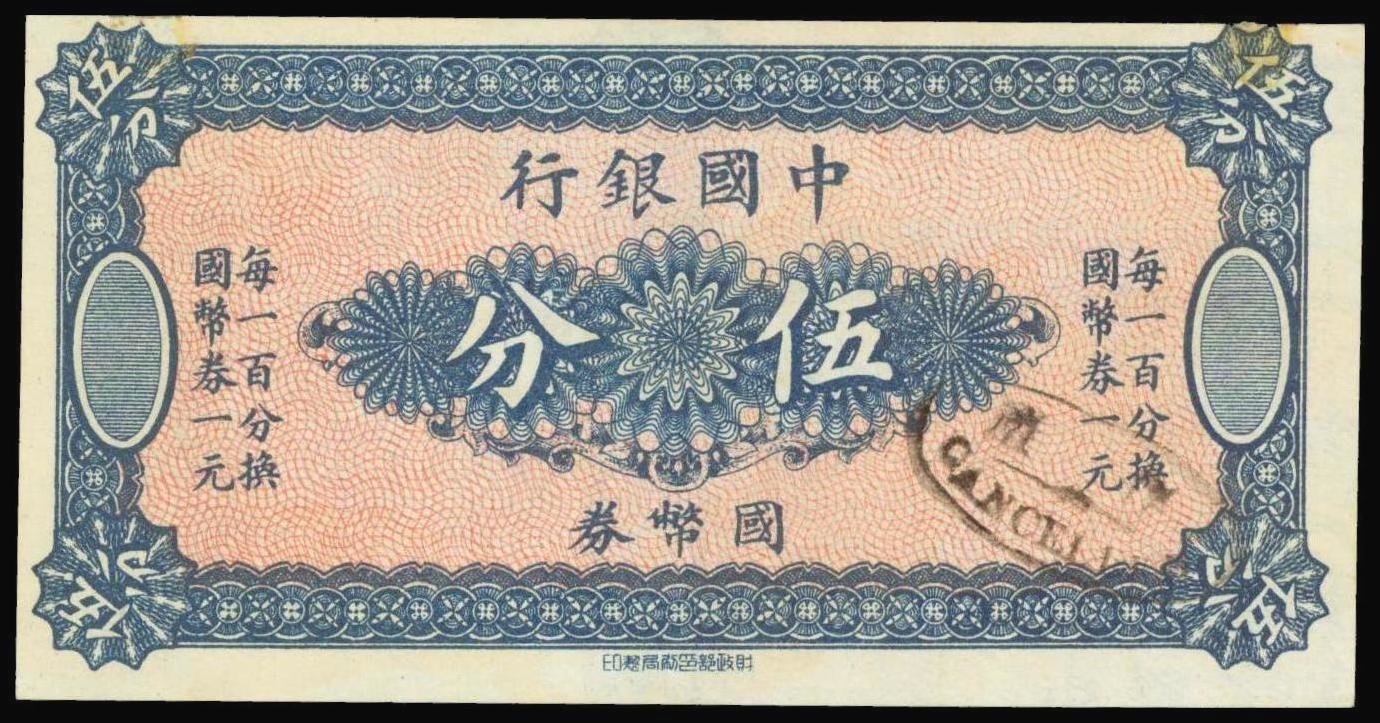 Bank of China,5 fen, ND(1918), no place name, small format,dark blue on red-orange underprint,