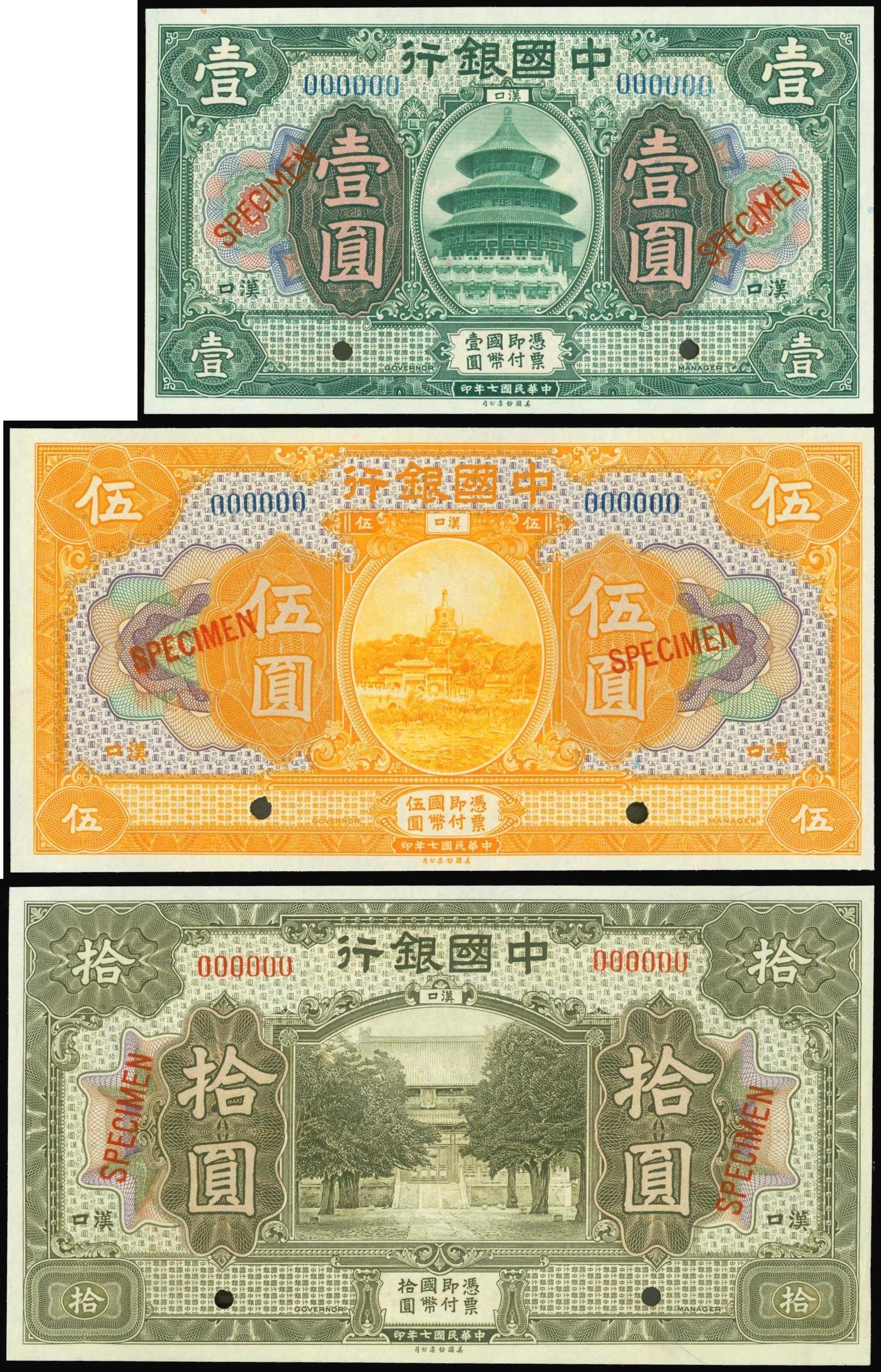 Bank of China,set of 1, 5 and 10 yuan specimen, 1918, Hankow,green, orange and dark green respectively,