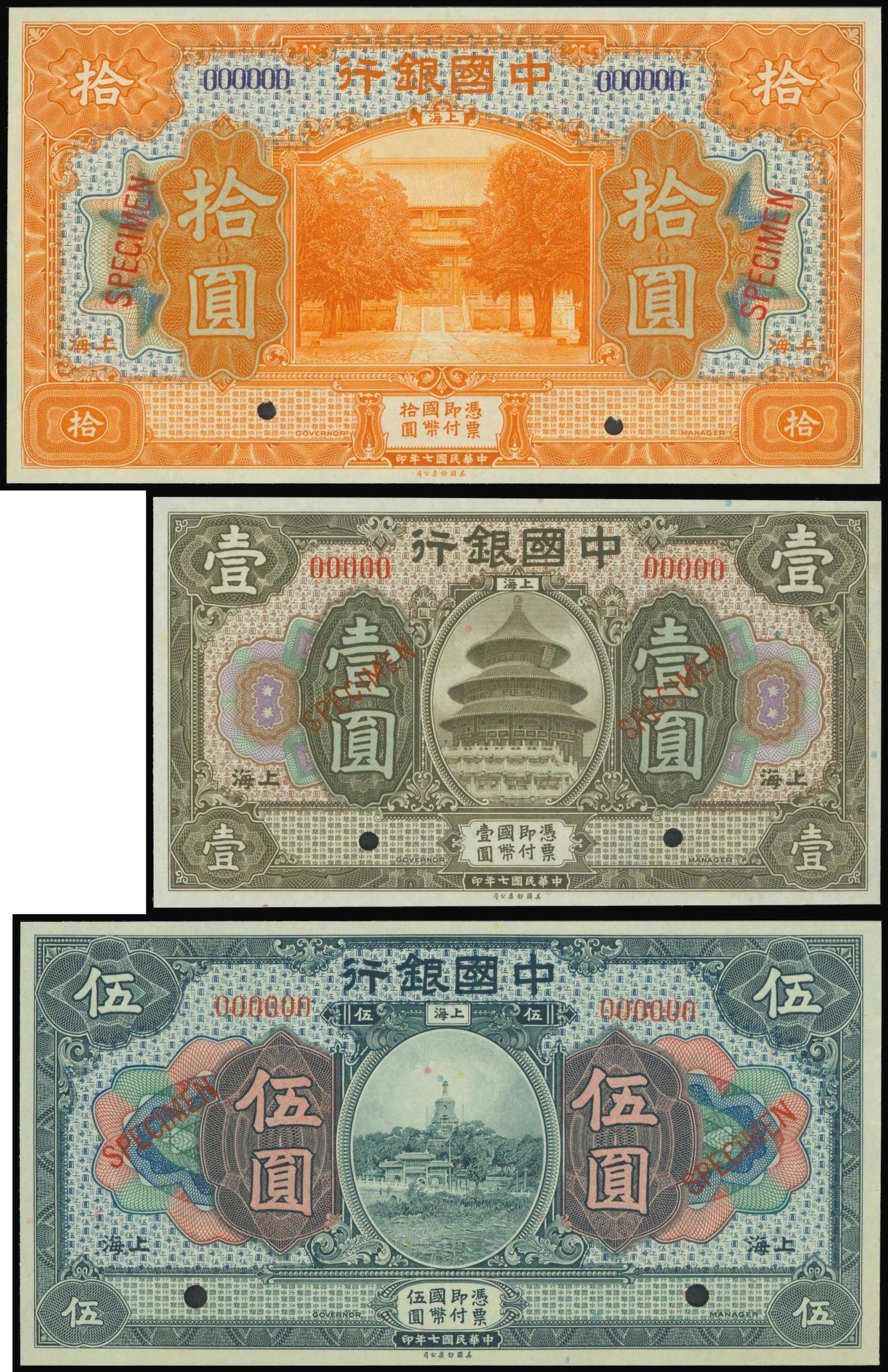 Bank of China,a set of 1, 5, 10 yuan specimens, 1918,olive brown, blue green, orange on light blue respectively, reverse blue, green and red respectively,