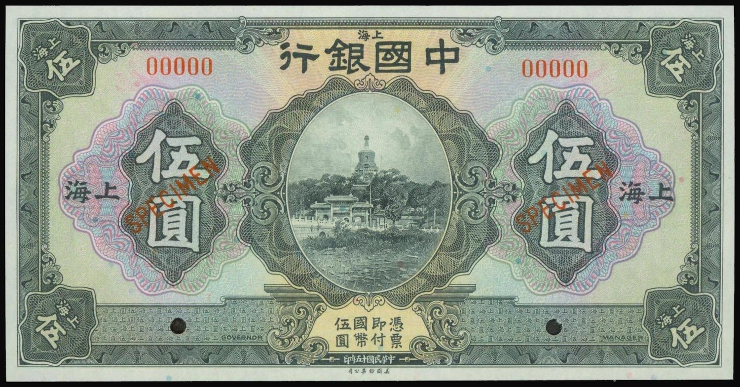 Bank of China,5 yuan, 1926, Shanghai, specimen, red serial number 00000,green on multicolour underprint, pagoda at centre, reverse green on multicolour, bank building at centre,