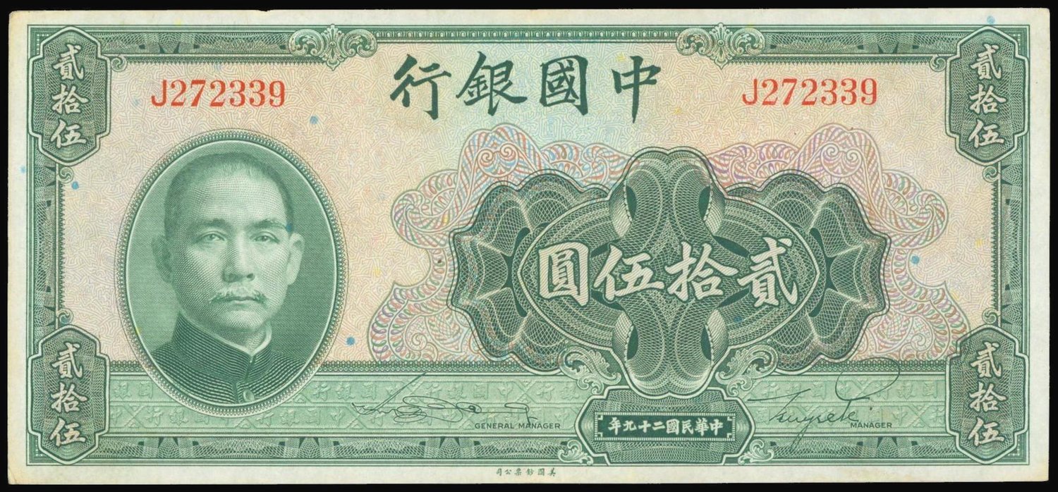 Bank of China,25 yuan, 1940, serial number J272339,green on multicolour underprint, Sun Yat Sen at left, reverse green, Temple of Heaven at right,
