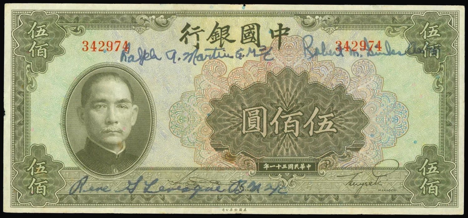 Bank of China,500 yuan, 1942, serial number 342974,olive and multicolour, Sun Yat Sen at left, reverse olive, Temple of Heaven at right,