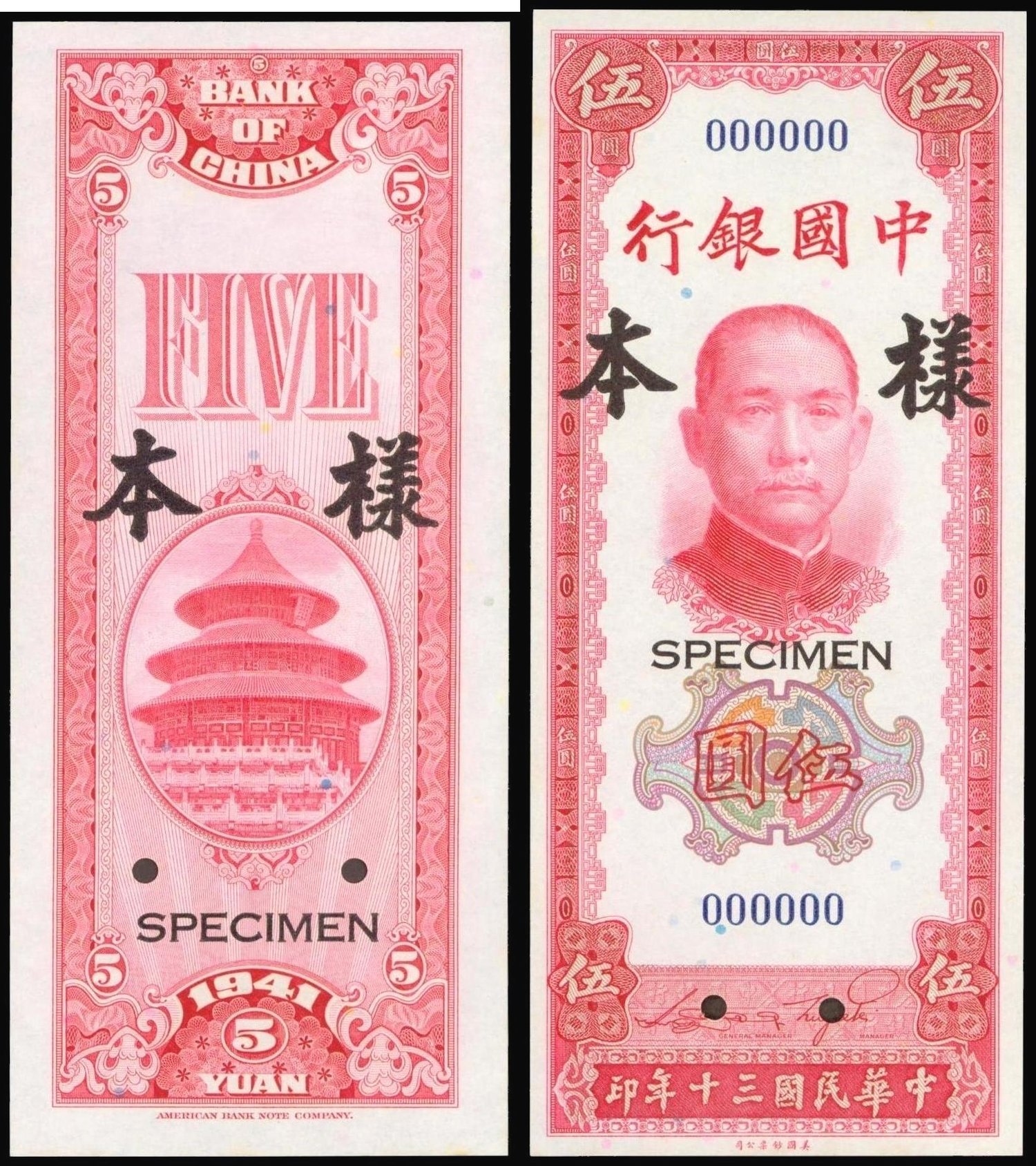 Bank of China,uniface obverse and reverse specimen of 5 yuan, 1941,vertical format, red, Sun Yat Sen at upper centre, reverse red, Temple of Heaven at lower centre,