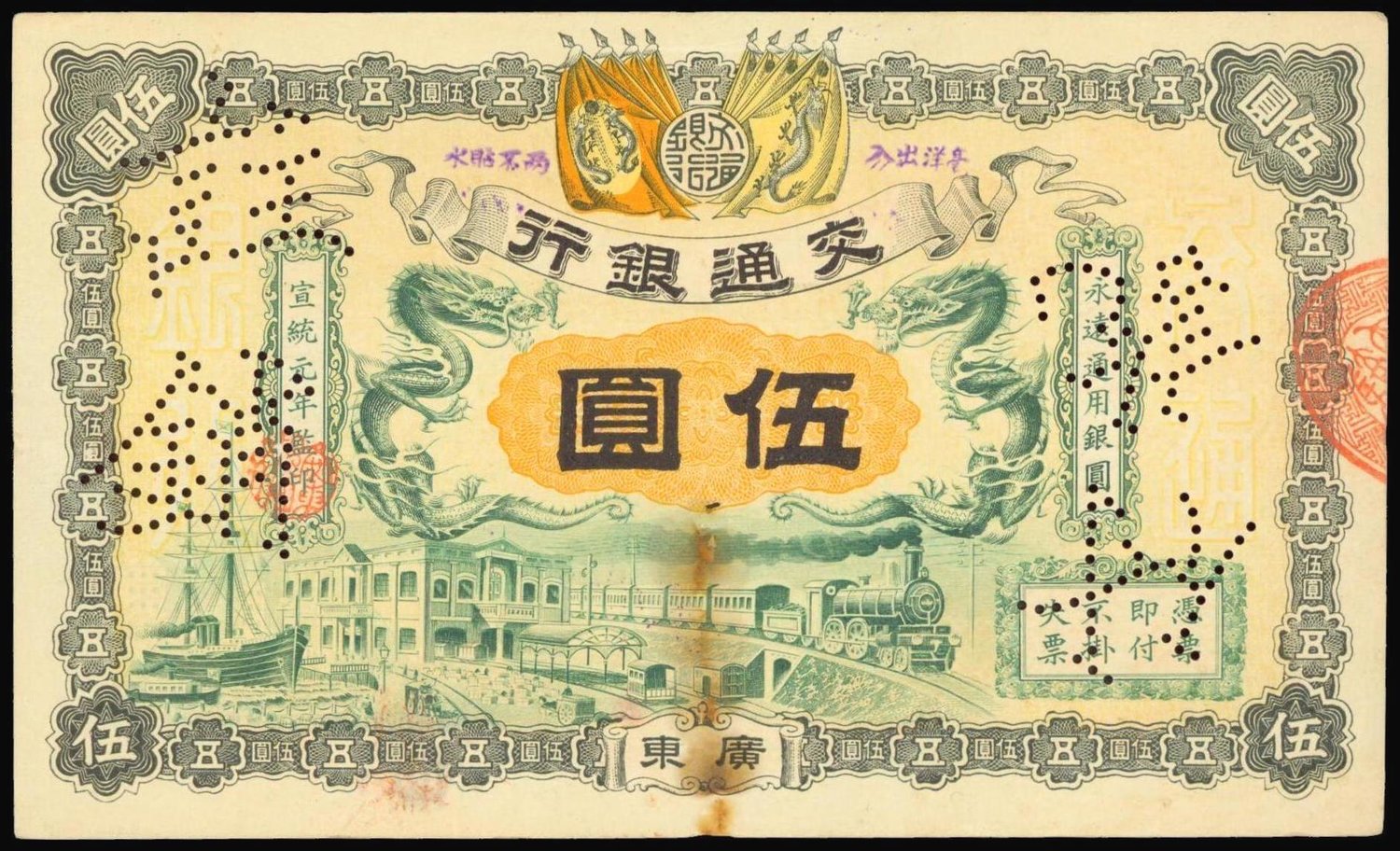 Bank of Communications,$5, 1909, Canton, serial number 067031,green and multicolour, two dragons facing value at centre, crossed flags at top, train, station, ship below, reverse red and green, cancelled with perforated Chinese characters,