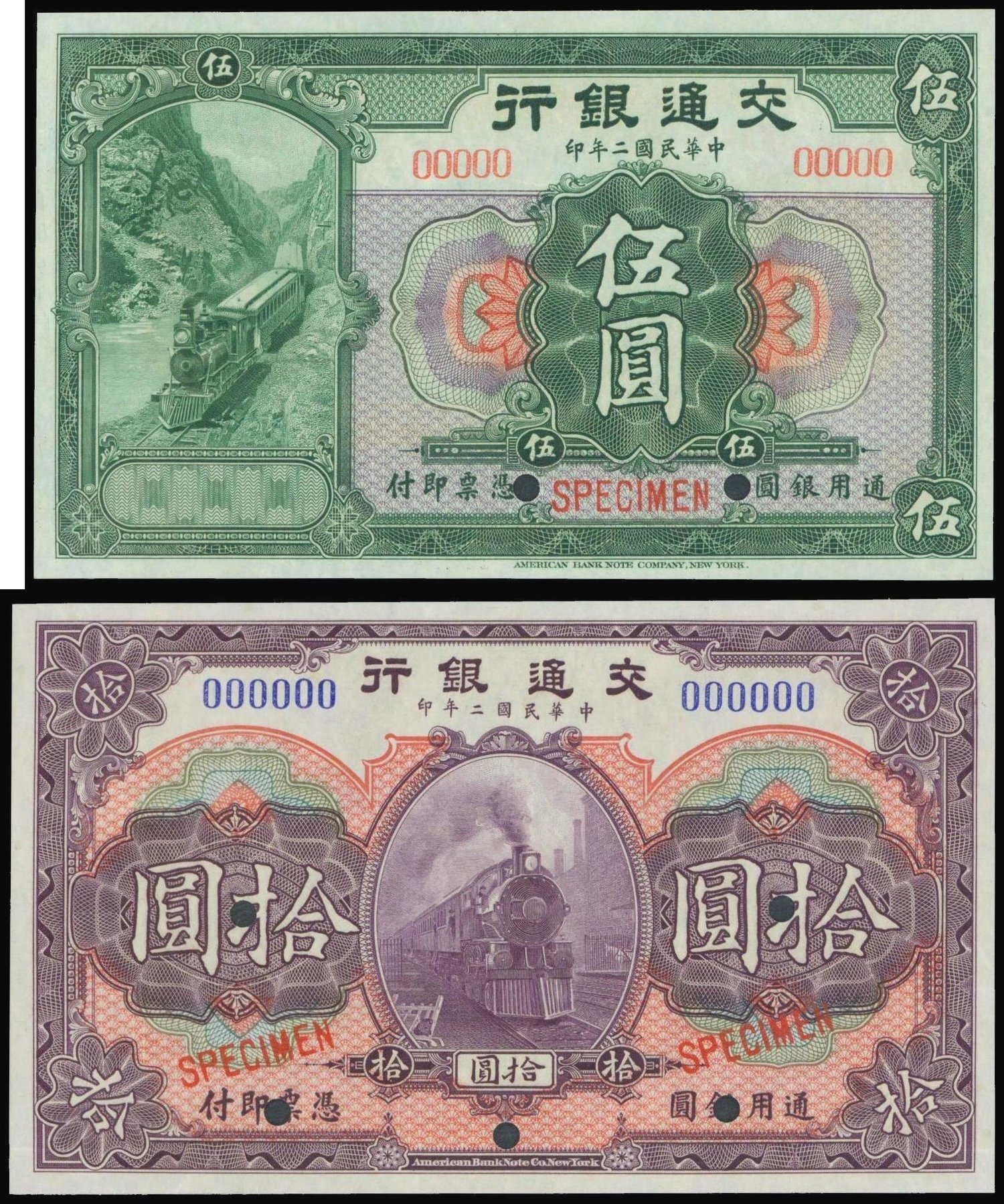 Bank of Communications,$5 and $10 specimens, 1913,green and purple on multicolour underprint respectively, steam train at left and centre,