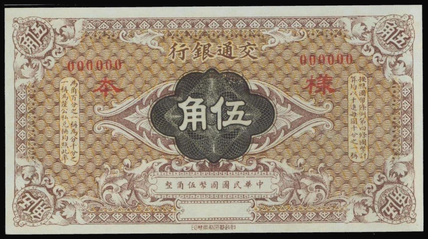Bank of Communications,5 choh(chiao), specimen, ND(1914), red serial number 000000,brown and black, value at centre, reverse green on light orange, text in English,