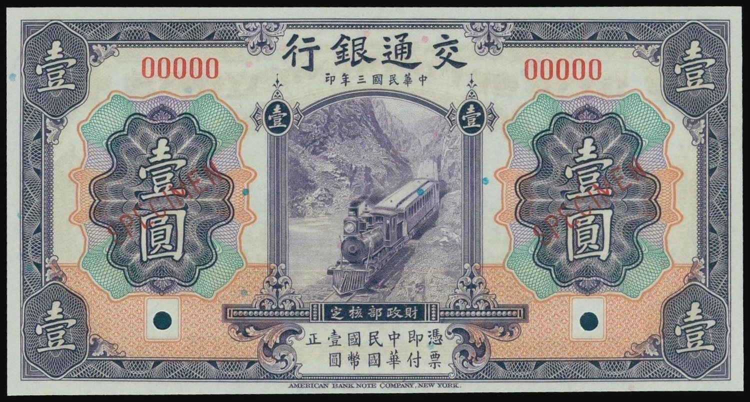 Bank of Communications, 1 yuan, 'specimen', 1914, serial number 00000, violet and multicolour, steam passenger train at centre, masted sailing ship on reverse,