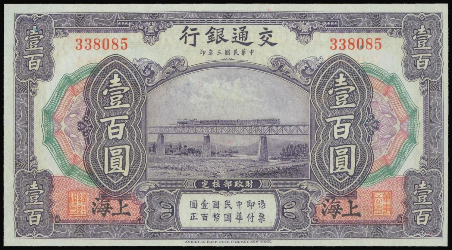 Bank of Communications,100 yuan, 1914, serial number 338085,purple and multicolour, train on bridge at centre, reverse purple, steam train at centre,