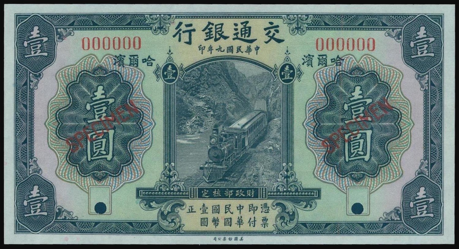 Bank of Communications, 1 yuan, specimen, Harbin, 1920, black, steam train at centre, reverse brown, sailing ship on reverse,