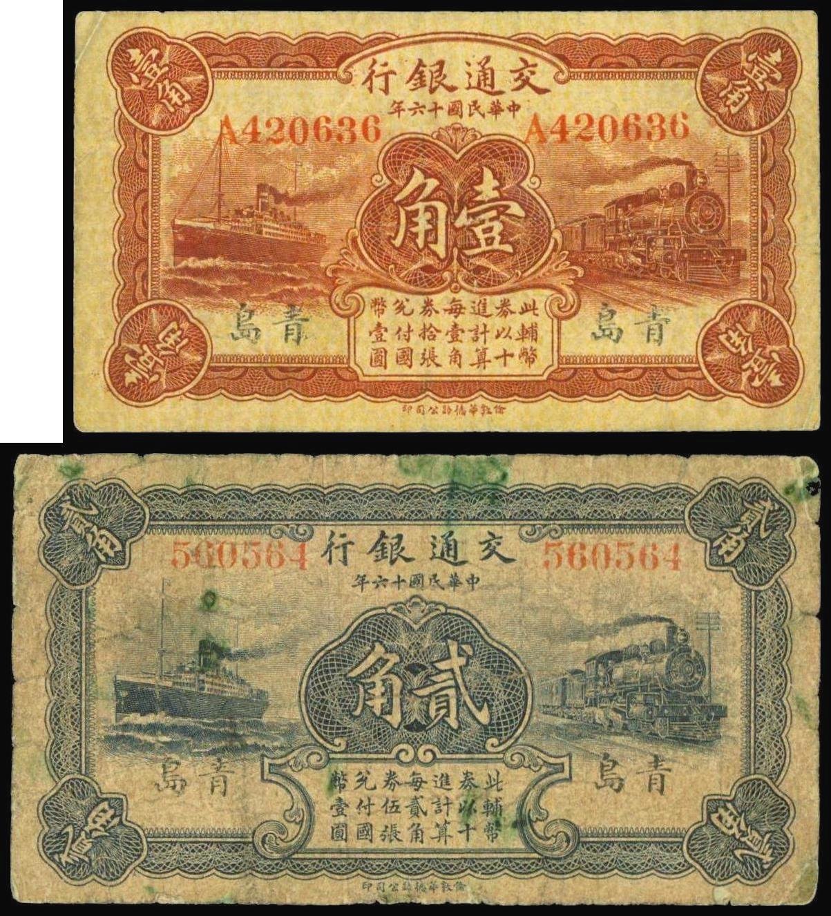 Bank of Communications,10 and 20 cents, 1927, Tsingtau, serial number A420636, 560564,red and blue respectively,small format, similar design, steam train at right, ship at left,