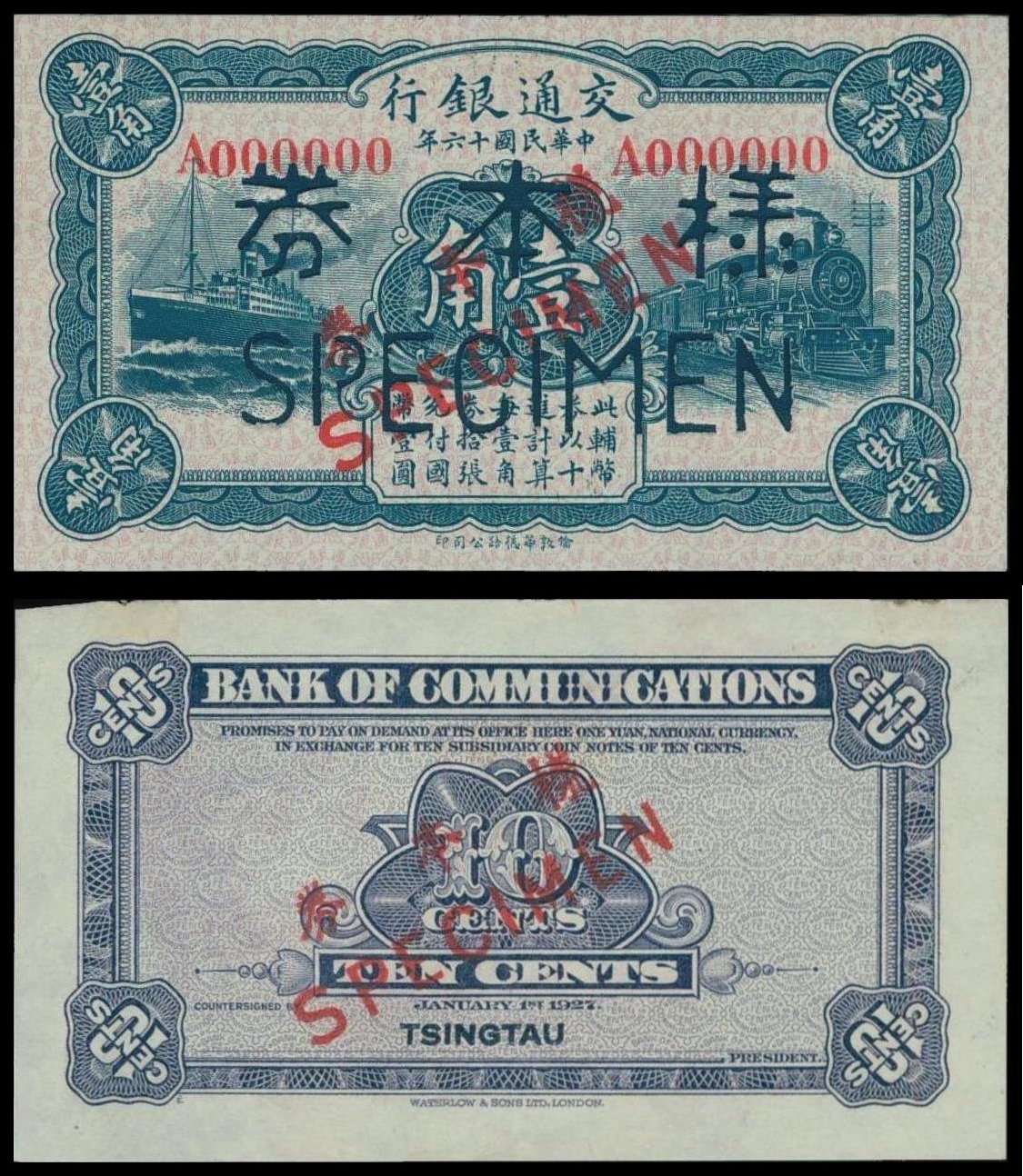 Bank of Communications, 10cents, uniface obverse and reverse specimen, 1927, serial number A000000, blue-green, ship and left and steam train at right, reverse violet, 'SPECIMEN' printed and perforated in Chinese and English text,