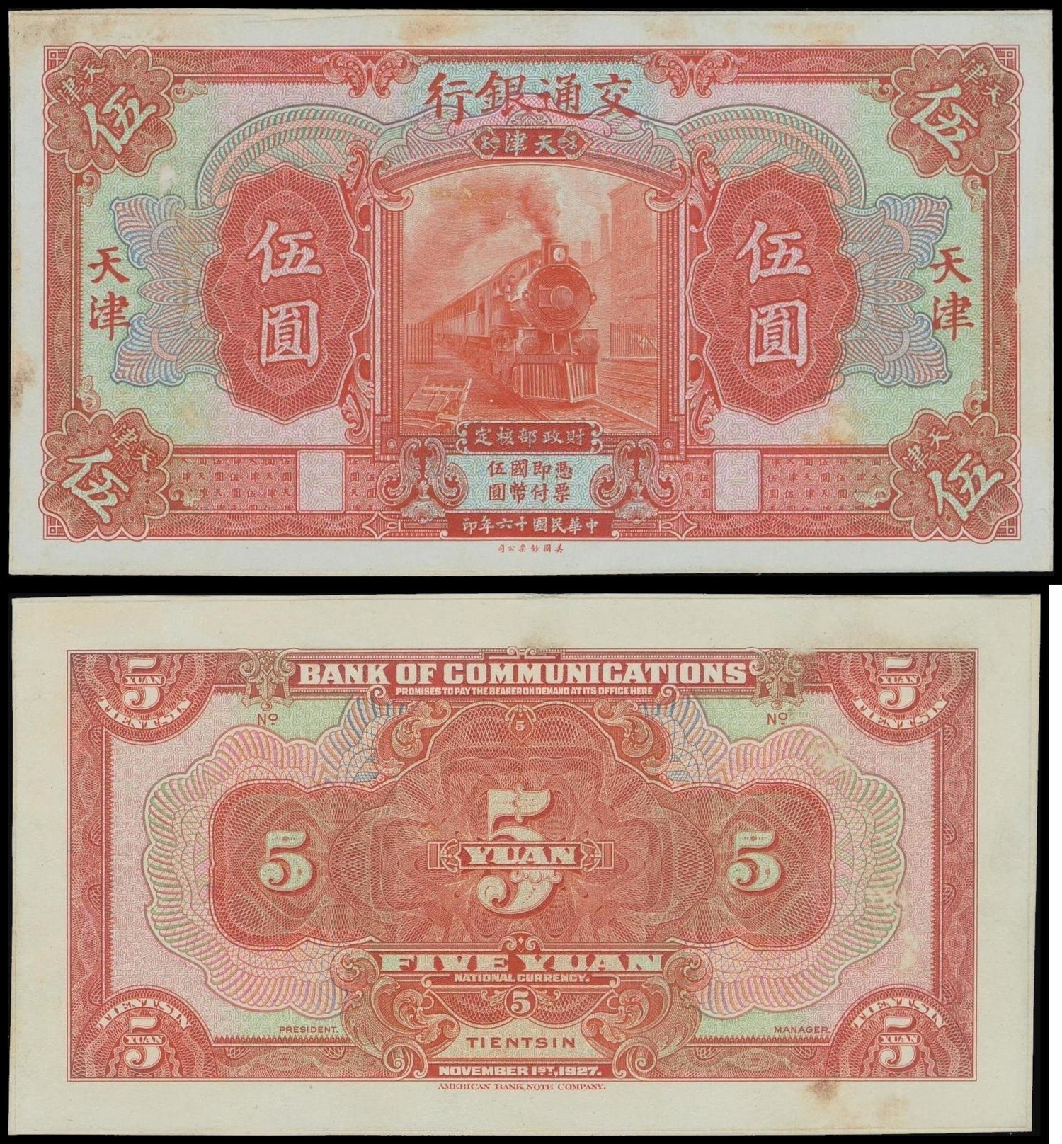 Bank of Communications, 5 yuan, uniface obverse and reverse proof on card, Tientsin, 1927, orange and multicolour, steam train at centre,