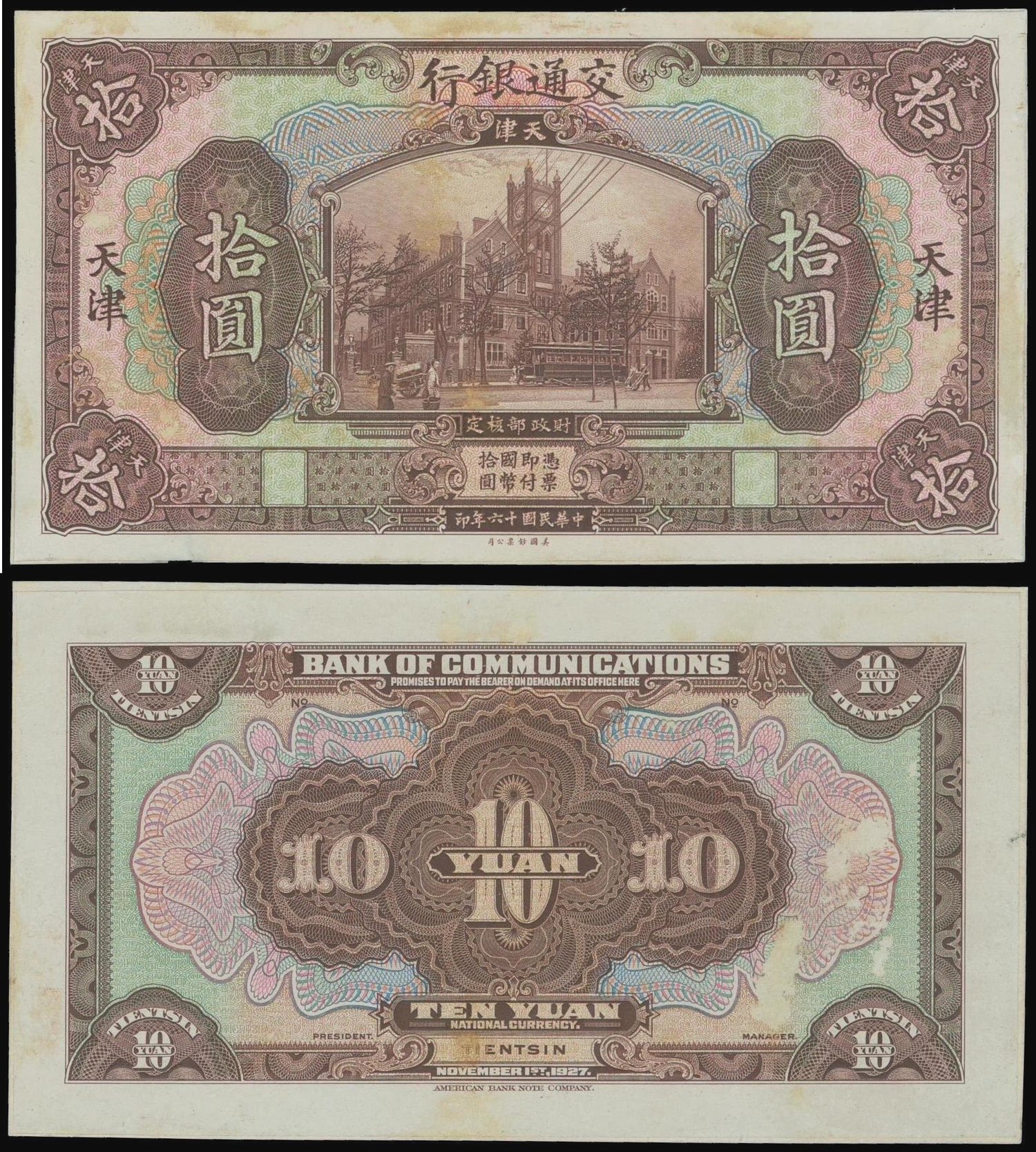 Bank of Communications, 10 yuan, uniface obverse and reverse proof on card, Tientsin, 1927, brown and multicolour, Customs Maritime building at centre,