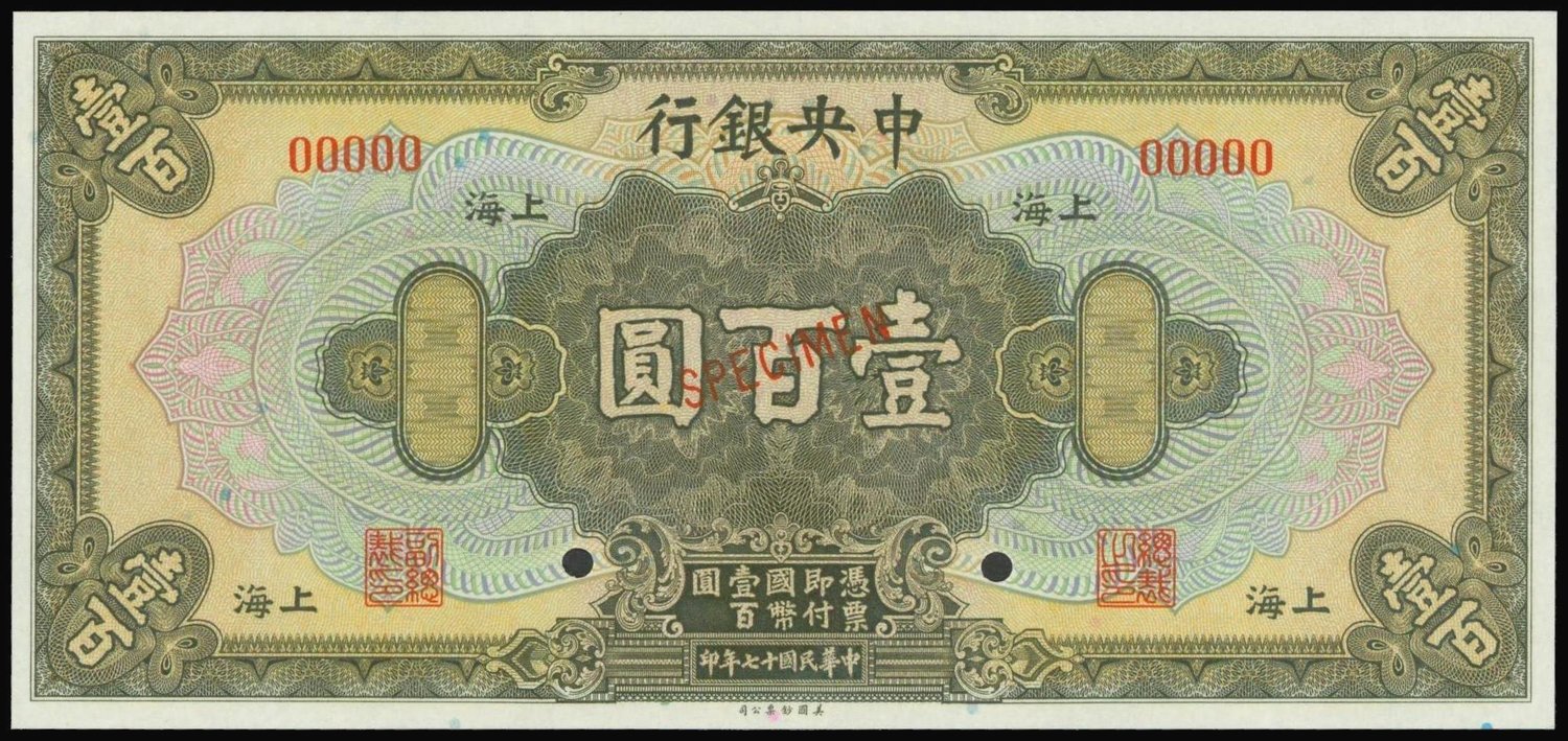 Central Bank of China,100 yuan, 1928, Shanghai, specimen,dark olive green on multicolour underprint, reverse purple, Sun Yat Sen at centre,