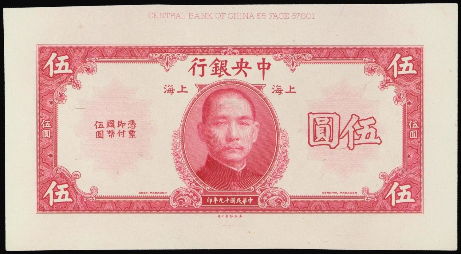 Central Bank of China,an uniface obverse $5 colour trial specimen, 1930,red on white, Sun Yat Sen at centre,