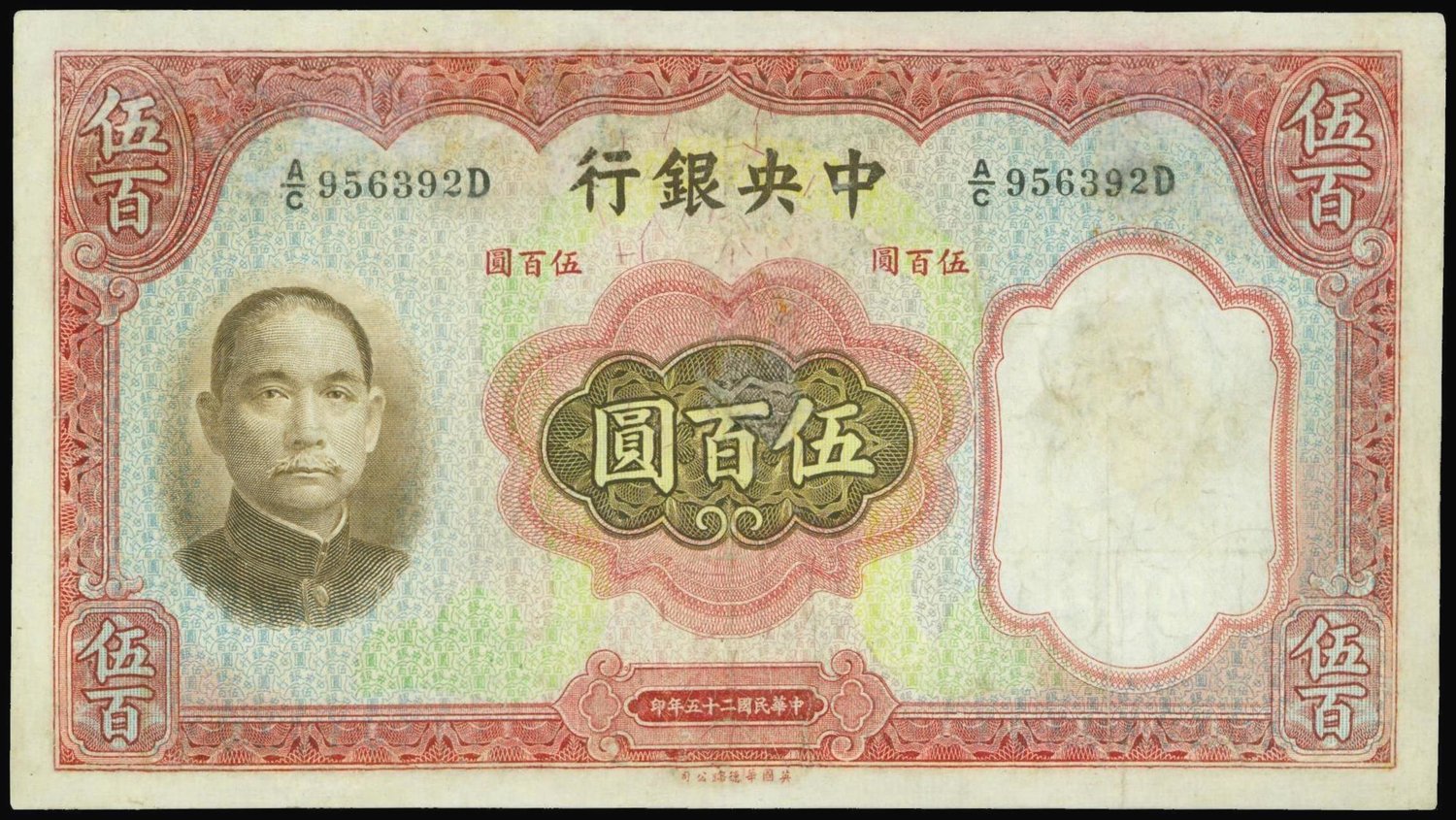Bank of China,500 yuan, 1936, serial number A/C 956392D,red on pale blue and yellow green, Sun Yat Sen at left,watermark at right, reverse green, temple at right,