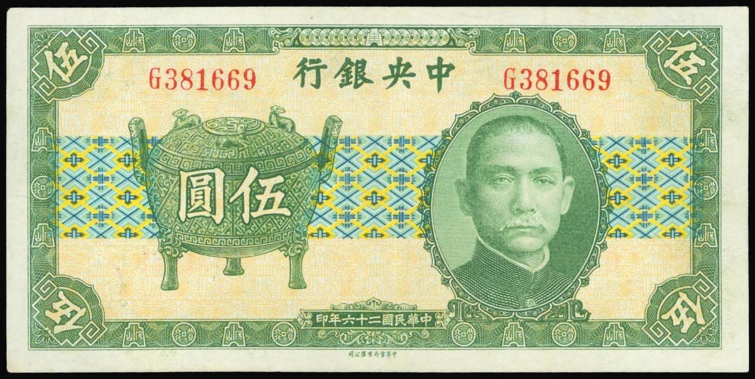 Central Bank of China,5 yuan, 1937, serial number G381669,green on multicolour underprint, Sun Yat Sen at right, bronze vessel at left,