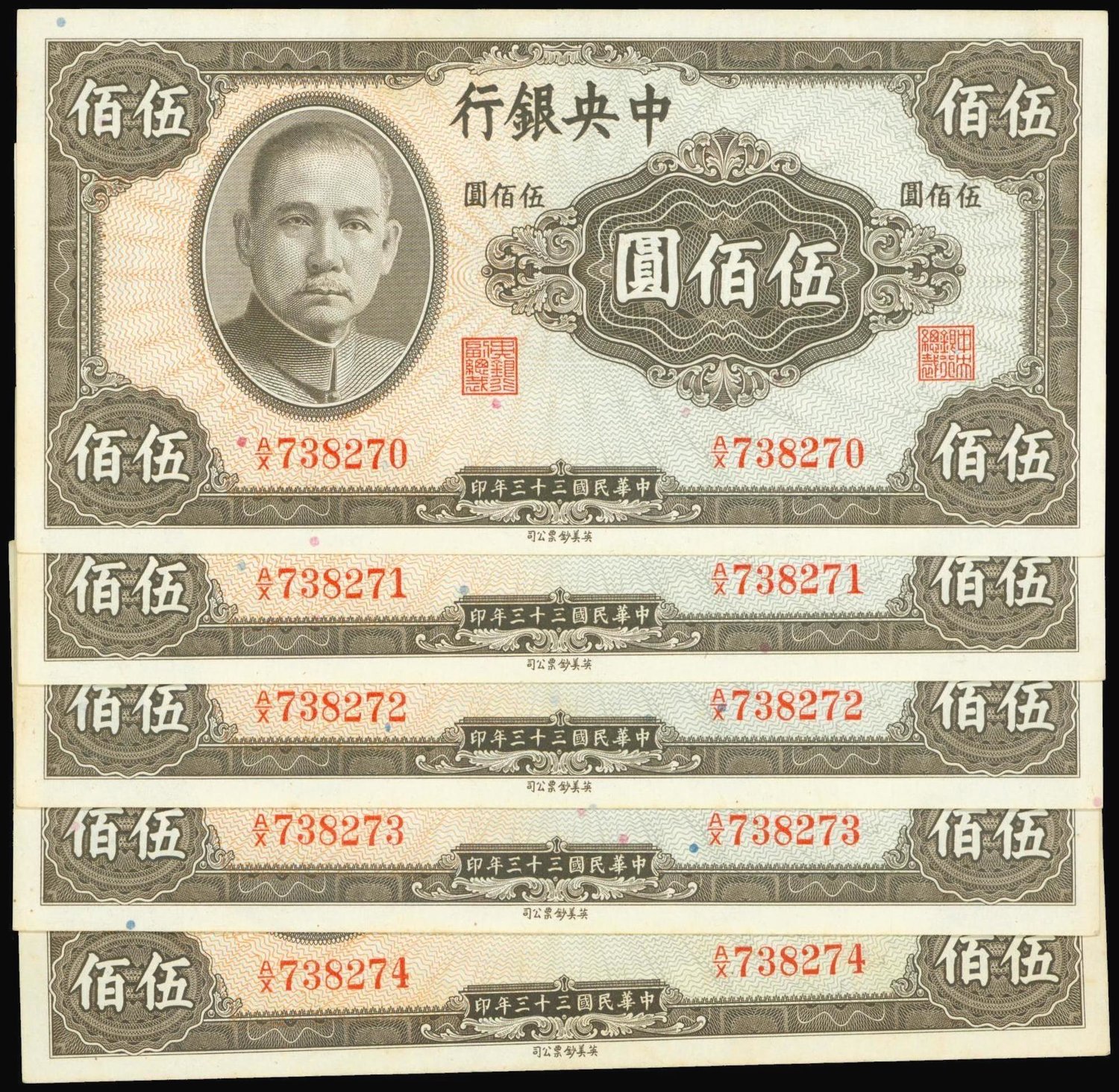 Central Bank of China,consecutive run of 5 x 500 yuan, 1944, serial number A/X 738270-4,brown on light blue and red, Sun Yat Sen at left, reverse blue,