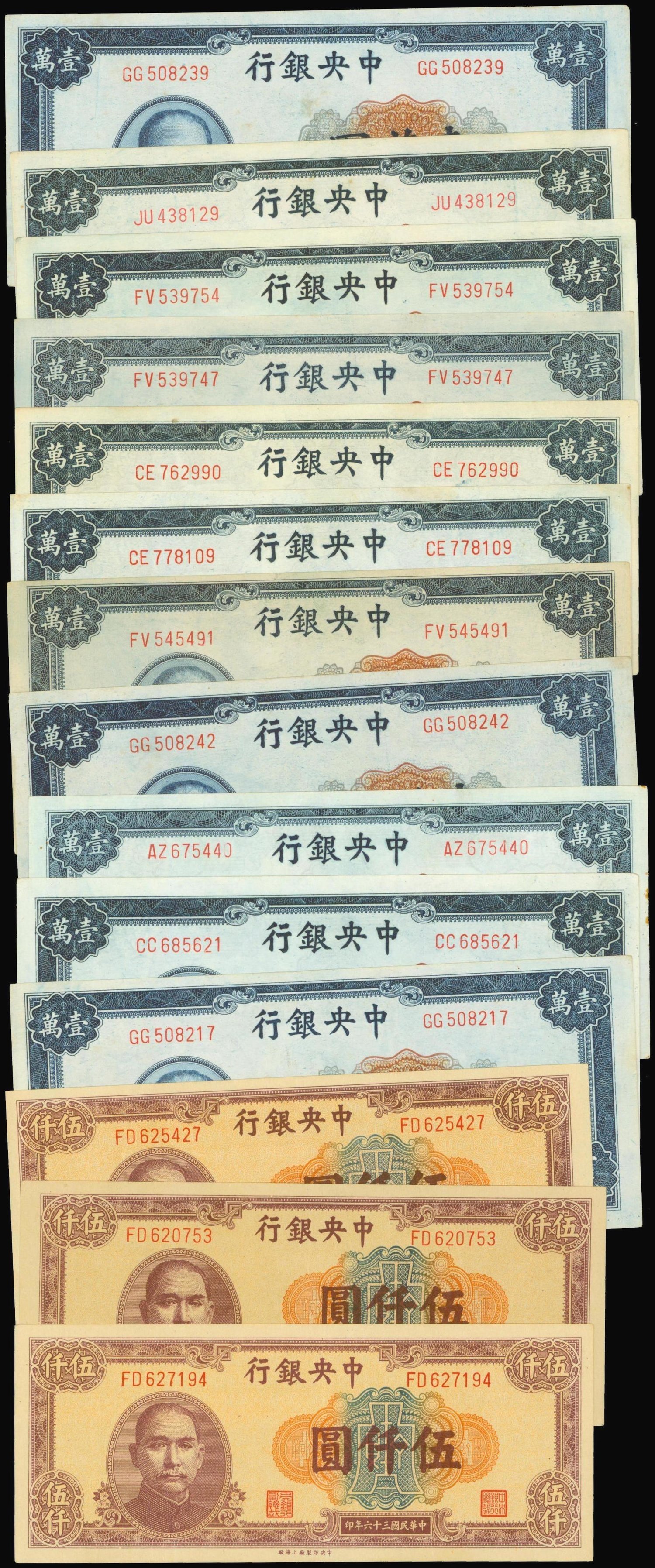 The Central Bank of China, a lot of 5000 yuan(3) and 10000yuan(11), lilac brown and dark blue respectively, Sun Yat Sen at left, reverse violet and grey-blue respectively,