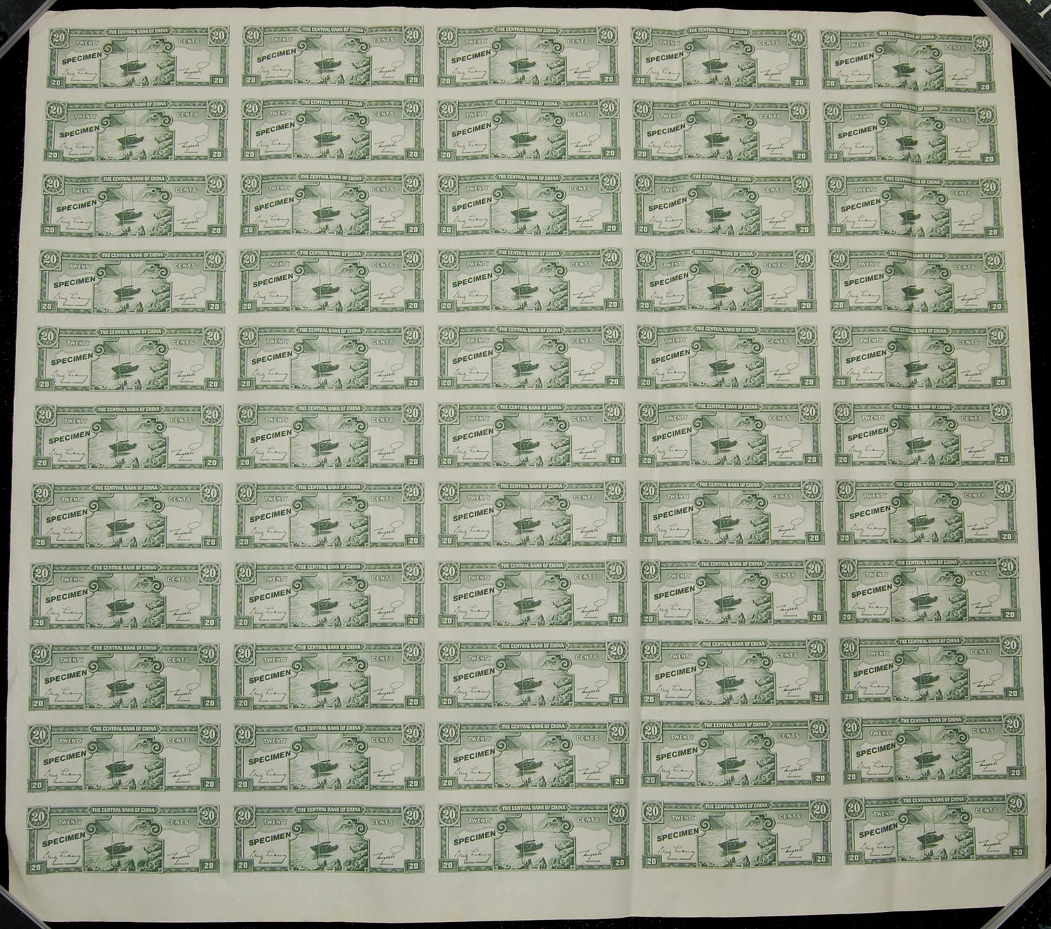 Central Bank of China, a large uncut sheet of 55 uniface reverse for 20 cents, 1946 (Gold Yuan issue), green, sampan on river at centre, '20' at each corner, 'Specimen' overprinted in green,