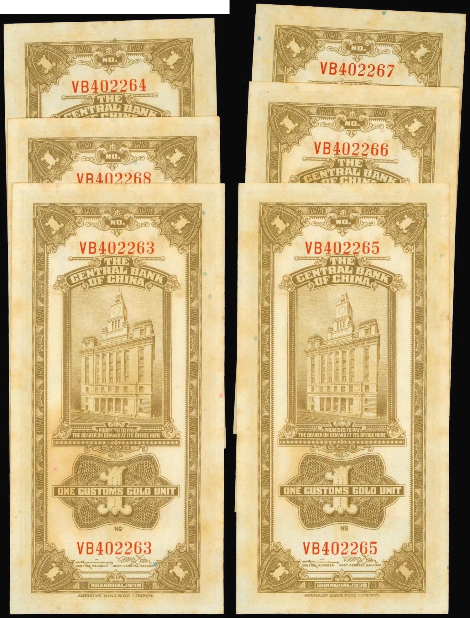 Central Bank of China,consecutive run of 6 x 1 CGU, 1930, serial number VB402263-8,vertical format, Sun Yat Sen at upper centre, reverse bank building at centre,
